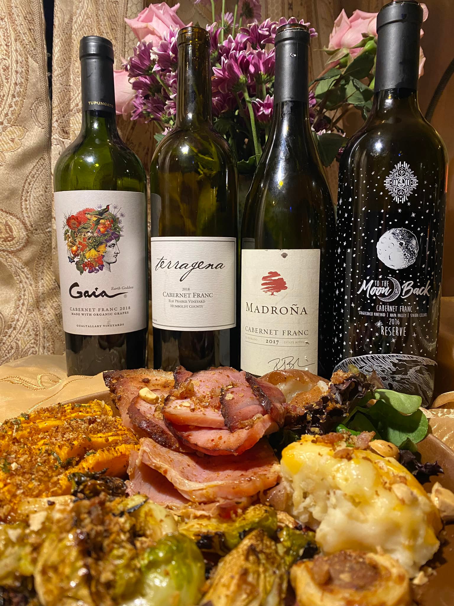 Here are the wines I shared with her, and which Sue and I paired with sausage puffs, smoked ham, cheesy mashed potatoes, roasted Brussels sprouts, and Hassleback squash for a festive holiday-style wintry feast perfect for celebrating Cabernet Franc Day today Dec. 4 or any day!