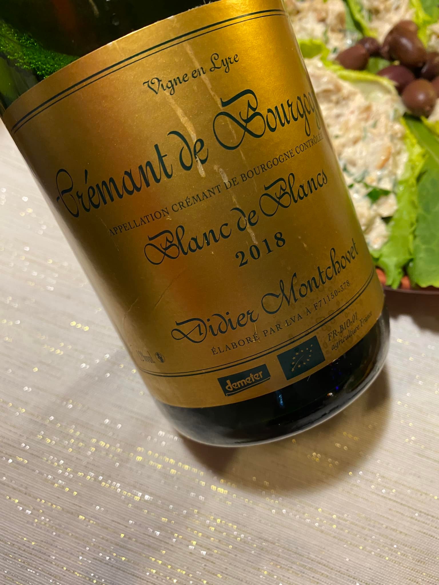 They say at the store where Sue purchased this that they can’t keep it in stock — it just flies off the shelves. The festive gold label clearly identifies this as a Demeter certified organic wine, and the wine is made from estate fruit from one of the pioneering farmers and winemaker in Burgundy.