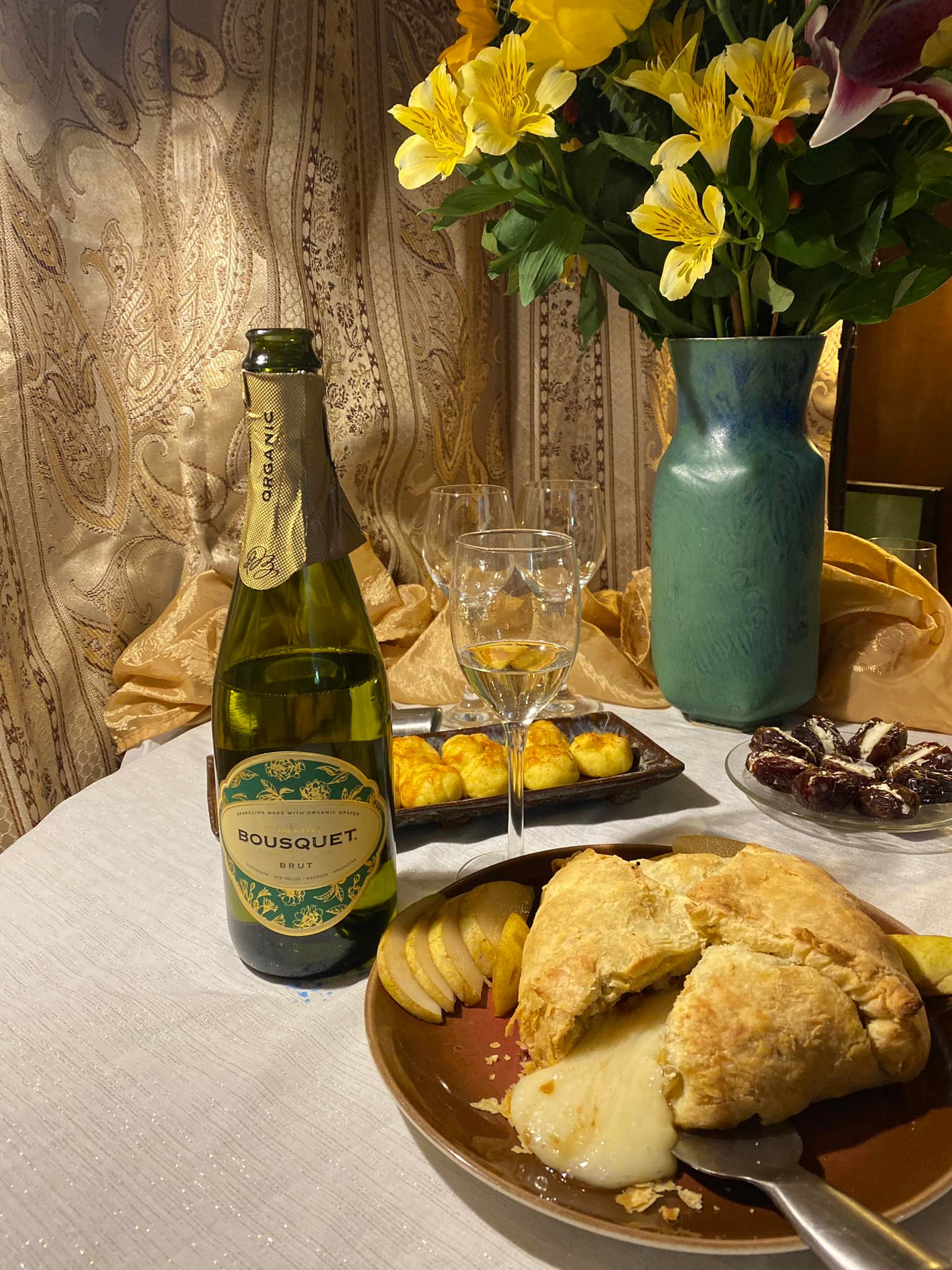 Pairing: With the baked brie, the pear and pecans with pomegranate paste is very elegant and luscious, and really works with the pecans; beautiful! Loves the cheese crusty ion top of the Gougères; this is a side or an appetizer to serve for sure. Fine with the Langres, and nice with the date and goat cheese — like a breakfast meal — the date and cheese like stuffed French toast — like. stuffed French toast; Sue”s favorite. The wine is great with steamed broccoli, fantastic with the mashed potatoes and gravy. The wine agrees with all of the spices that are in the crispy chicken.