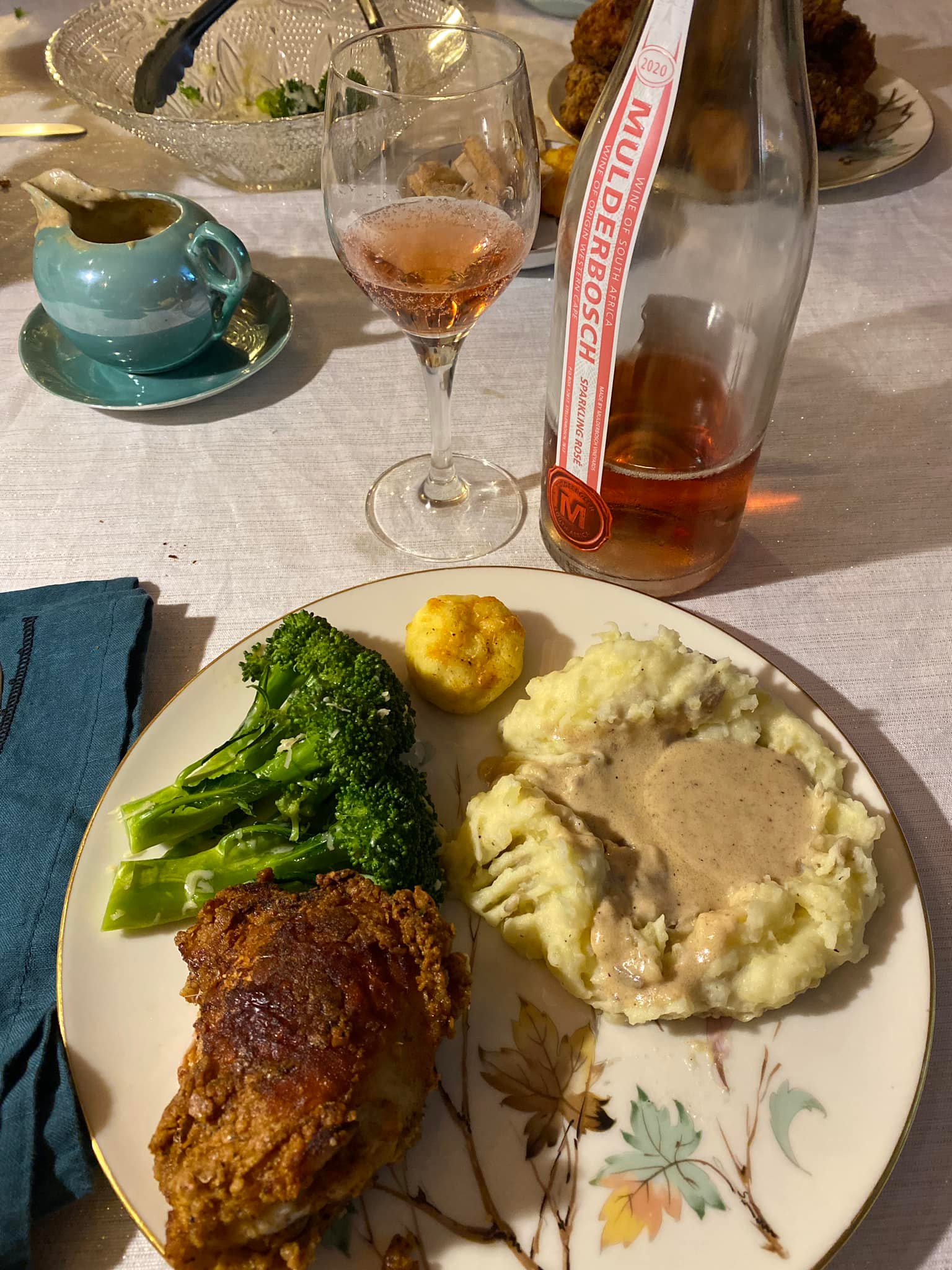Fried foods pair so well with sparkling wines AND we’re celebrating my birthday! Growing up, for my birthday meal, my mom made chicken fried steak with mashed potatoes. and my dad made gravy plus my dad’s mom made the best fried chicken so this meal connects me with my family on my birthday where I was joined by Sue Hill, her SO John Walsh, Clos Des Amis winemaker Gretel Compton, plus my husband and son.