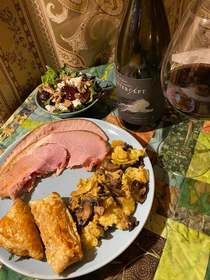 Pairing: Pate brought out rose petals in the wine. While the wine works with the brie, it really loves the pate: the spices in the pate enhance the wine so nicely. Rich food cuts through the heavy oak treatment so well. Think osso bucco or lamb shanks. Sue was surprised that she was ready to put more wine in her glass because with the oak it was not her favorite wine but once paired with the right food it worked for her. Pork and pinot is a winner, and in this case the smoked ham stood up well to the oaky pinot. The earthy flavors in the beet salad also worked well.