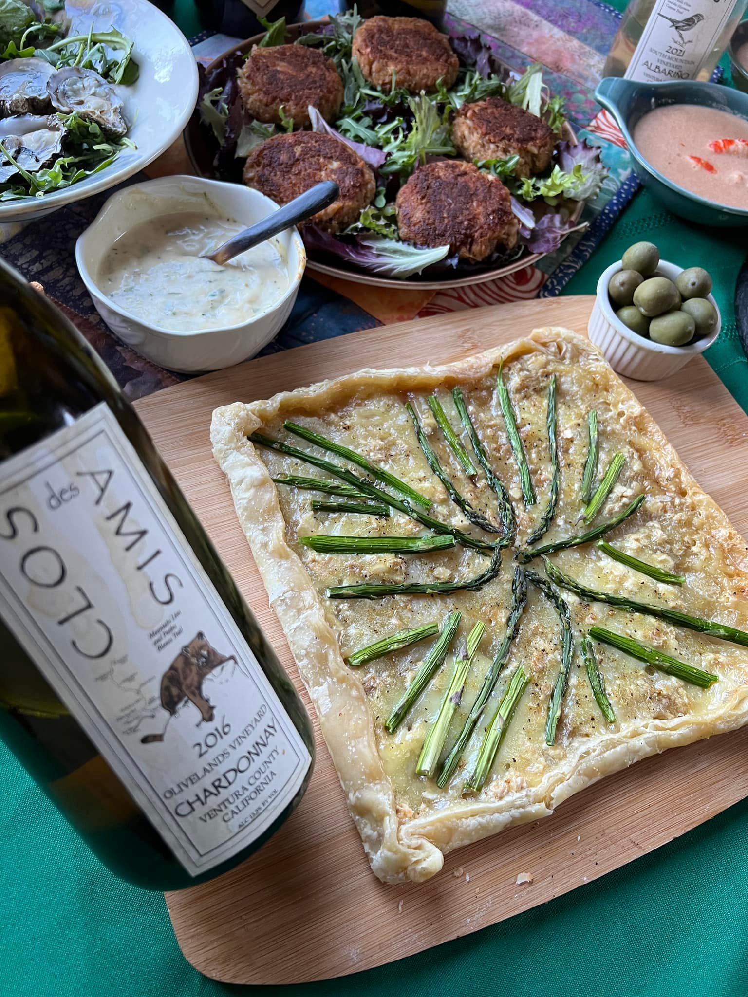Pairing: The bisque and the wine elevate each other so much, the wine becomes sweet and floral, tuberose on the palate. Nice with the crab cakes, the aioli brings both the dish and the wine together so nicely. Our favorite was the asparagus brie tart and the wine. So fantastic with the dessert.
