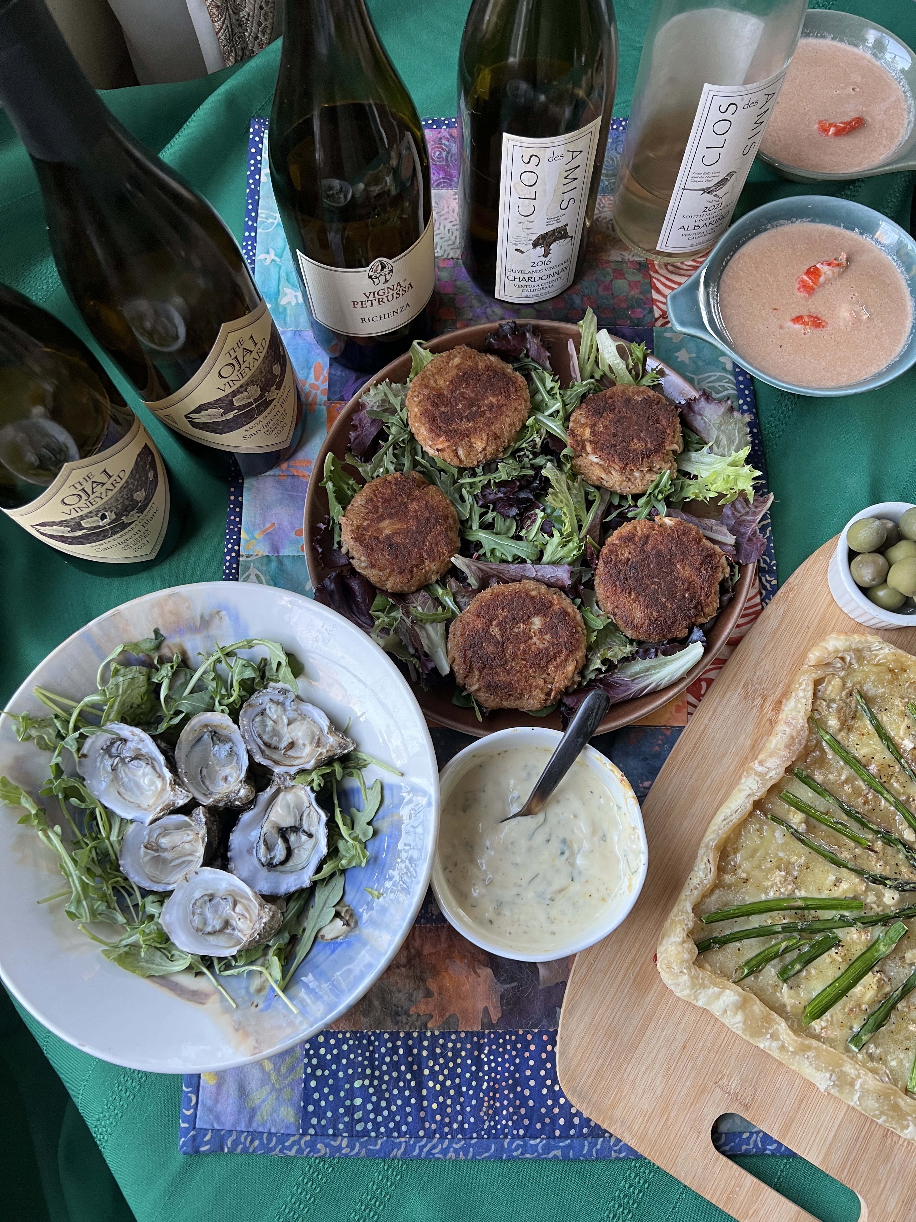 Pairing: This is a go to oyster pairing wine. The oysters are very sweet and brings out the lemon in the wine. Fantastic with goat cheese on top of a rosemary raisin cracker. The crab cake is nice, but the aioli brings the entire meal together. Great with the asparagus on our tart.