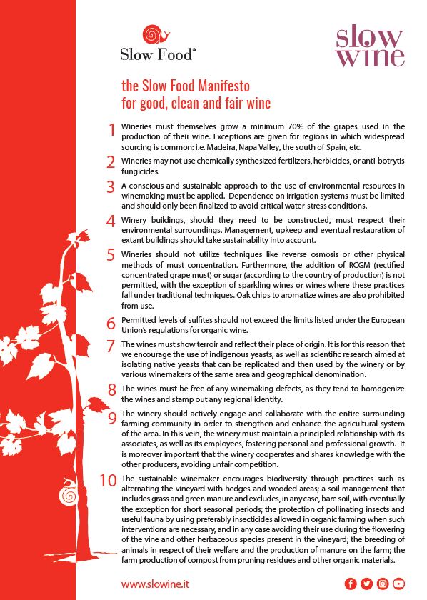 In short, the Italian Manifesto for Good, Clean, and Fair Wine requires Italian wineries to: