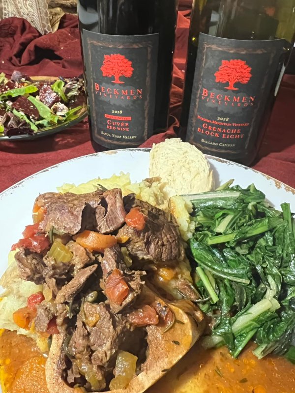 Beckmen Vineyards Grenache and Grenache blend paired with osso bucco, greens, and beet salad