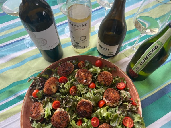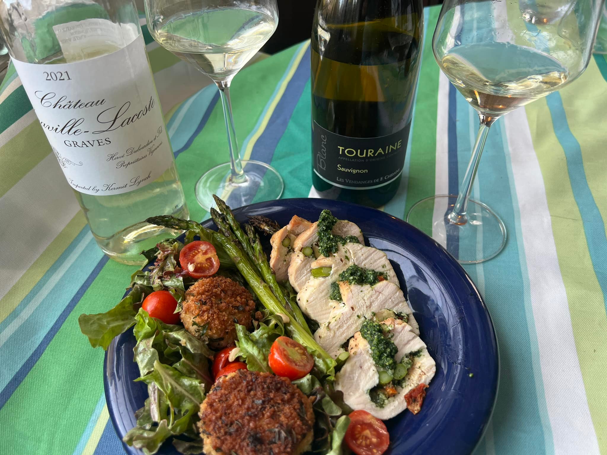 In this corner, Loire Valley Sauvignon Blanc from Touraine. And in that corner, Sauvignon Blanc from Bordeaux’s Graves. Let the competition begin! First, a straight tasting. And then pairing with Grilled Pesto Stuffed Chicken and an amazing fried goat cheese salad!