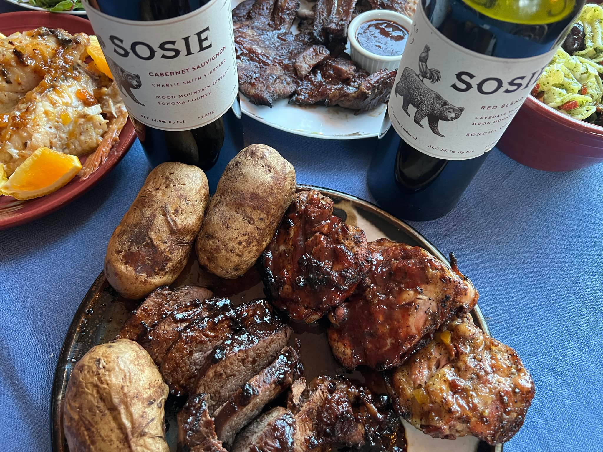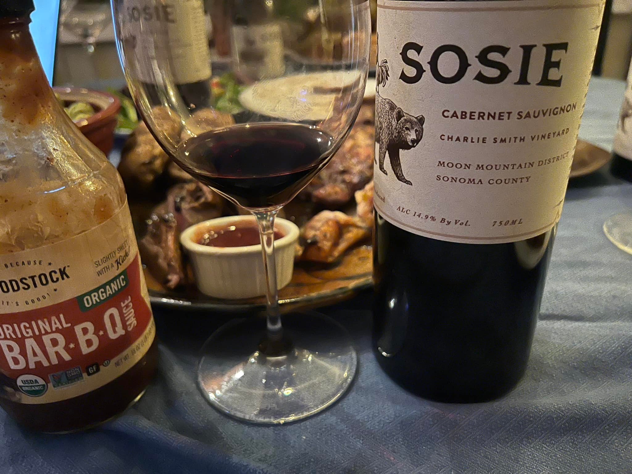 Pairing: The ribs are nice with the wine, because the wine is a bit bigger than the ribs. The wine, however, works perfectly with the grilled beef. It loves the hickory smoke and the big bold flavors of the meat. Until we tasted this wine with the grilled beef we did not feel it was any more special than the cab blend,