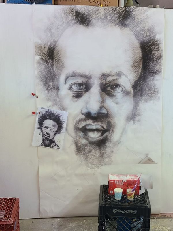 This in progress 5′ x 5′ portrait by Valerie Mallory will be part of her Burning Man 2022 installation “Secretly Abandoned Spaces”