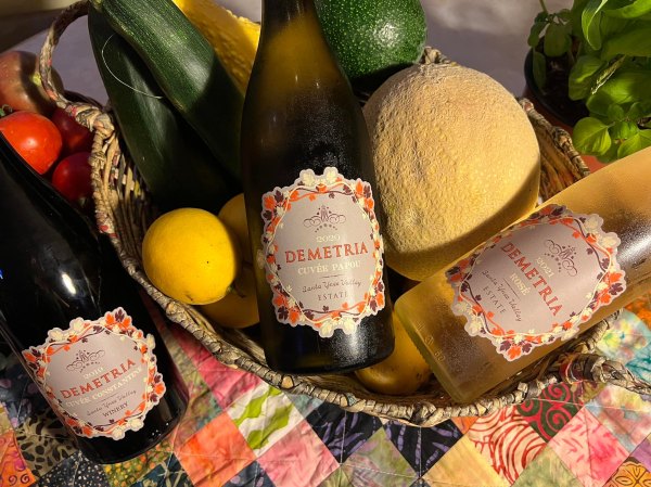 3 biodynamic wines from Demetria with a farm basket of organic fruits and vegetables
