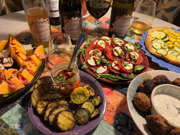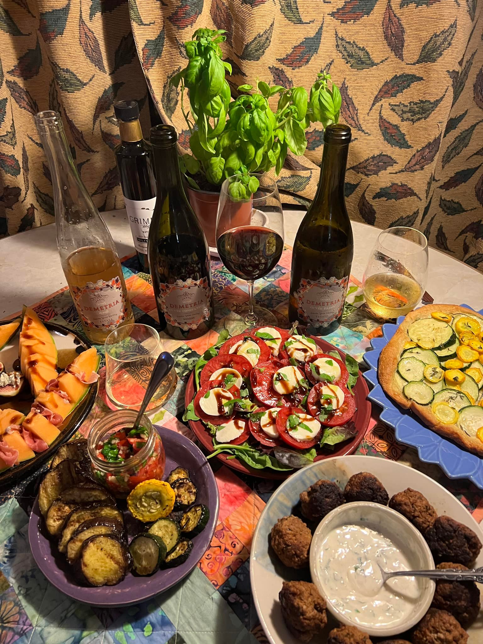 The zucchini tart was also lovely with the wine. The thyme in the tart was also perfect in highlighting the herbal characteristics in the wine. The wine handles the garlic and basil in the bruschetta topping and is a great companion to the grilled veggies. Absolutely perfect with our capresse salad. A margarita pizza would also be great with the wine.