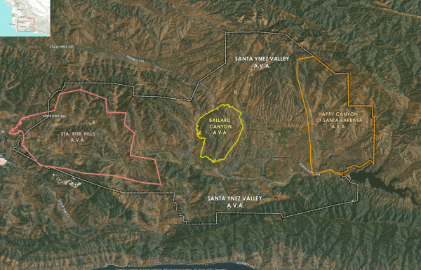 The Santa Ynez Valley AVA, noted in red above, is one of two larger AVAs, and it wraps around some of the smaller ones.
