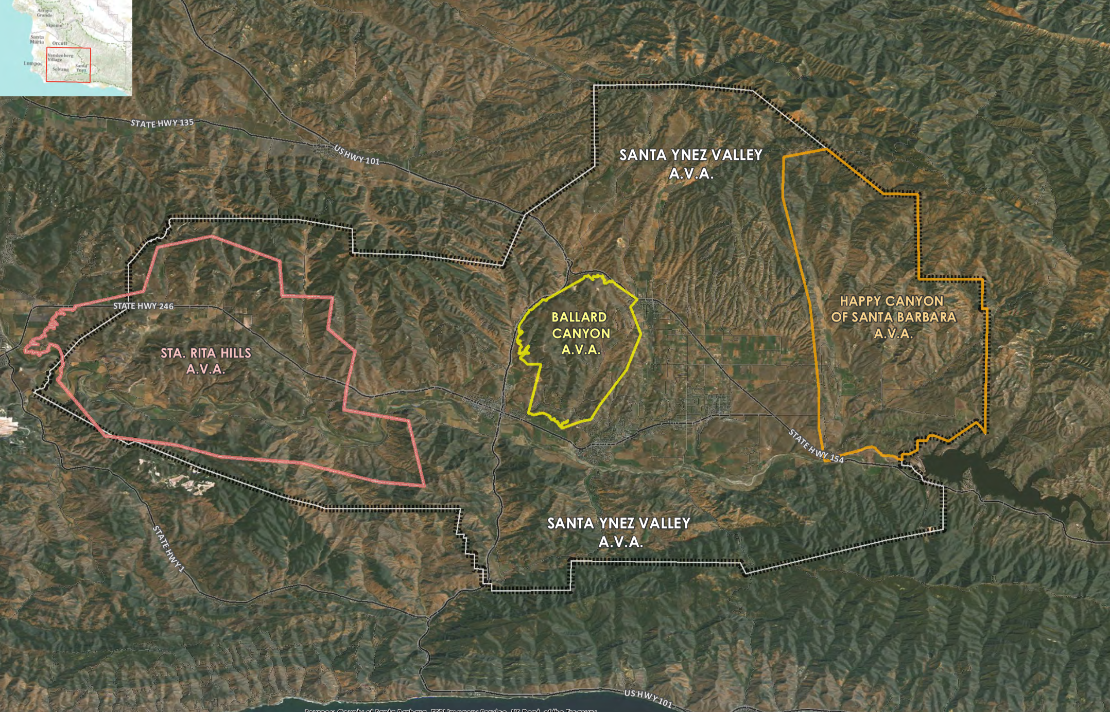 The Santa Ynez Valley AVA, noted in red above, is one of two larger AVAs, and it wraps around some of the smaller ones.