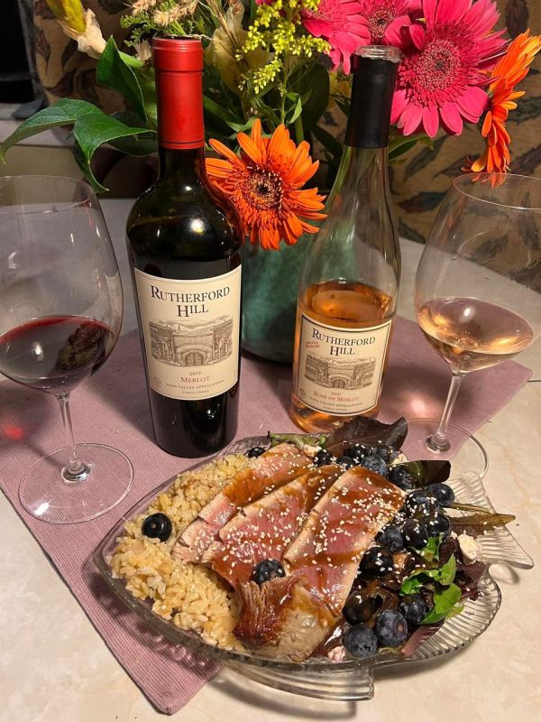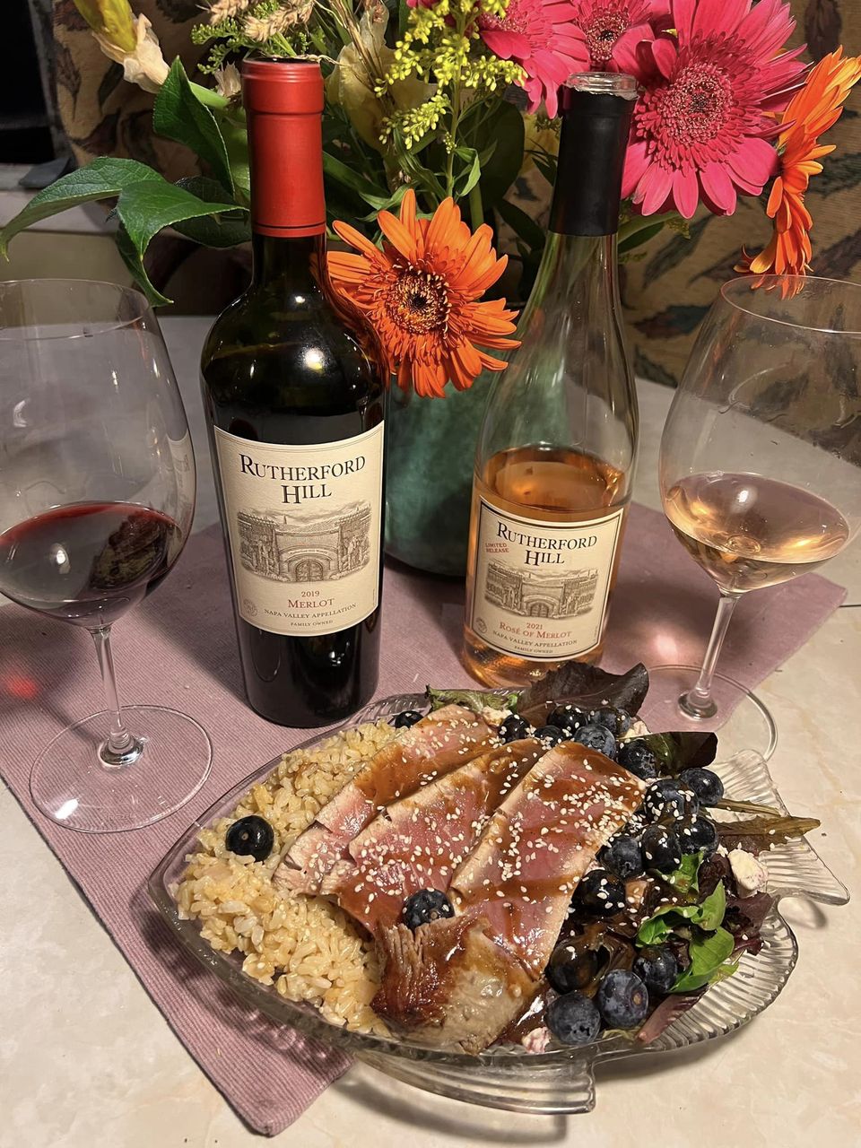 After a week of cool drizzly weather, a very warm fall day caught me by surprise. Fortunately we had some fresh ahi tuna in the fridge to sear and present on leftover lobster risotto and a salad with blueberries and cranberry stilton to pair with two wines from Rutherford Hill: a 2021 Rose of Merlot and a 2019 Merlot, named top Napa Merlot under $40.