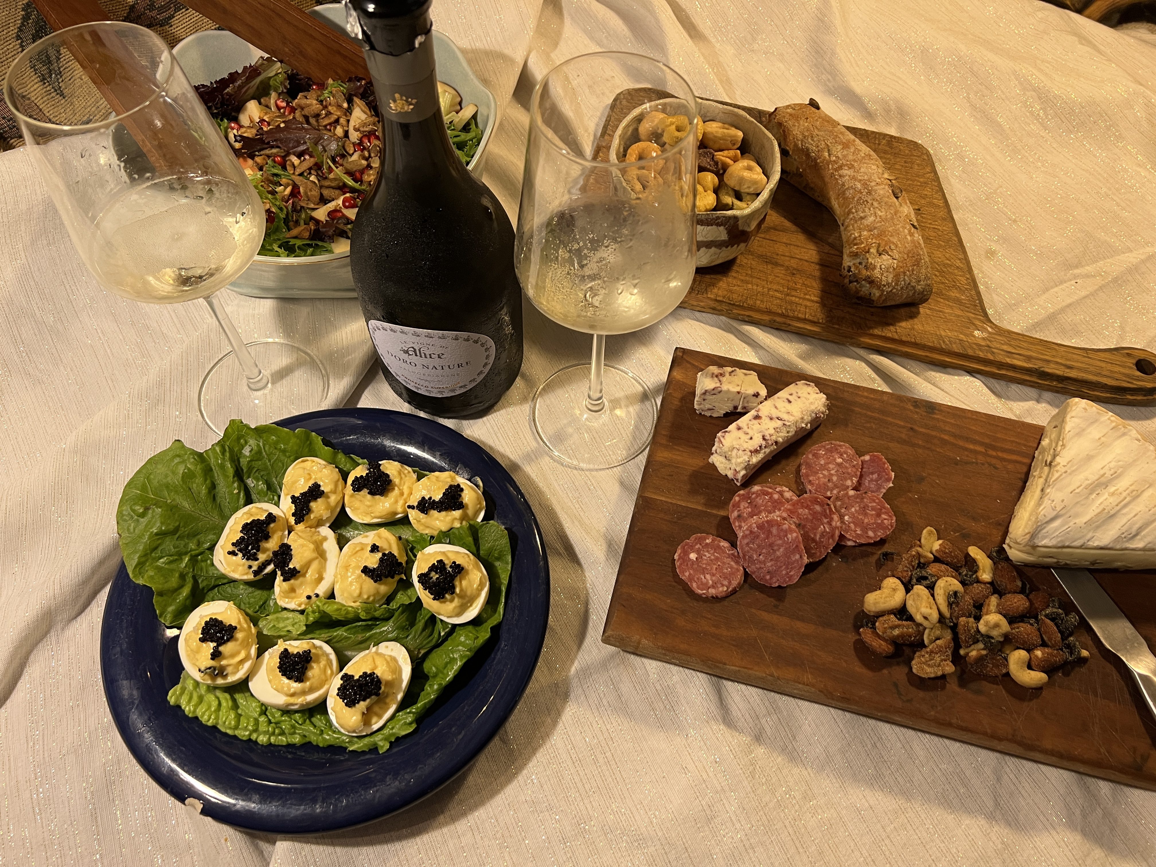 Pairing: The olives in our olive loaf bring out the fruit and florals in the wine. The smoked deviled eggs are just lovely with the Prosecco, an absolutely perfect pairing with the creaminess of the eggs contrasting with the minerality of the Brut as well as the complexity and the effervescence of the Prosecco DOCG. This Prosecco DOCG also worked well with the savory, dried almonds on the cheese tray but even better with the mushroom brie making us thinking about mushroom risotto or stuffed mushrooms. So good with the salami on the cheese plate: it loves the salt, fat, and spices in the cured meat and brings umami to the wine.