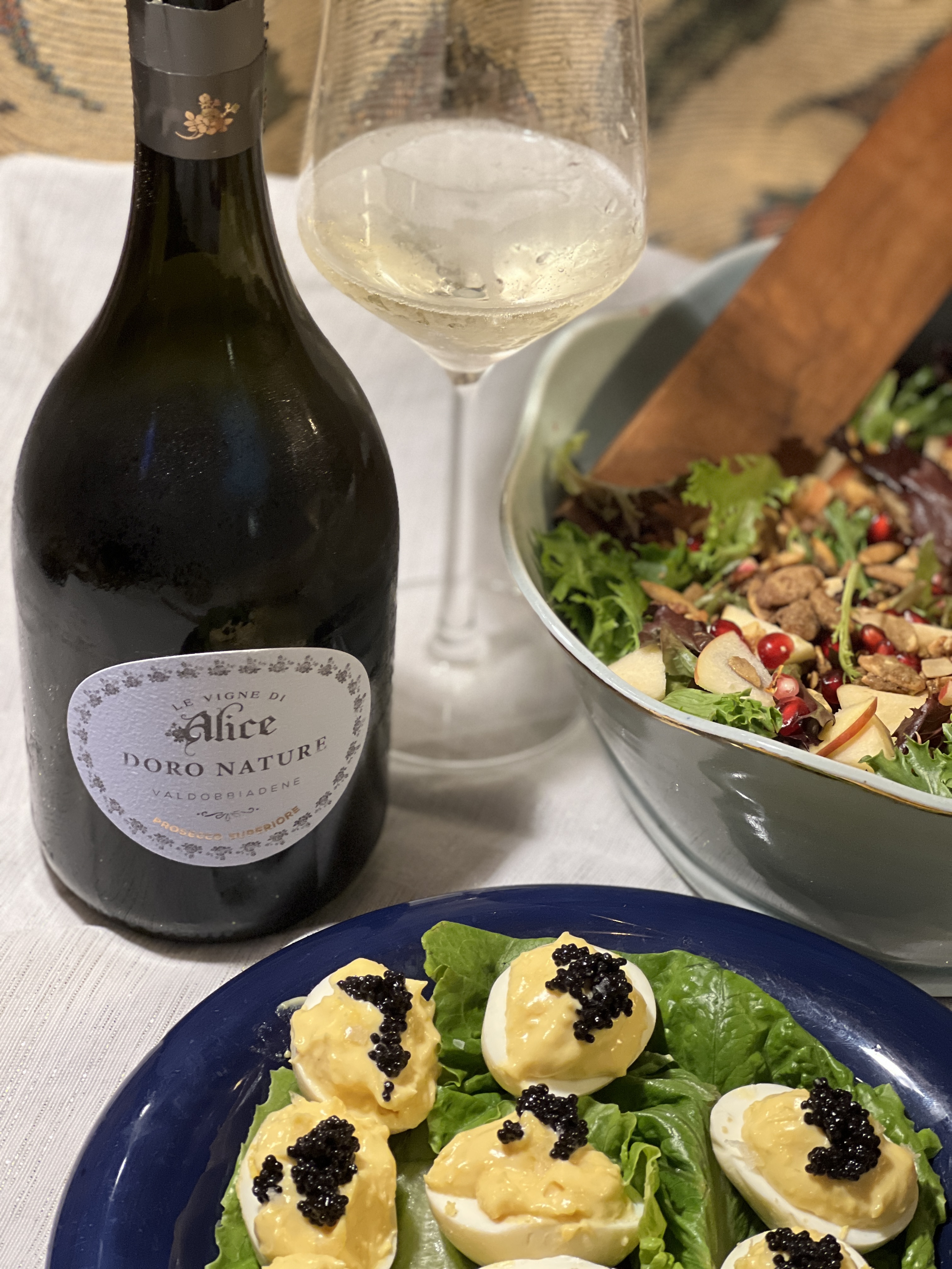 To participate in the contest, we received this bottle of Alice Prosecco DOCG, and decided to go with a simple but special, delightful and healthful recipe perfect for holiday gatherings: smoked deviled eggs with caviar (recipe follows tasting notes).