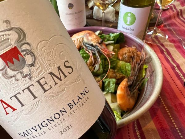 Pairing: OMG with oysters, there is so much character and drama when the two meet, and the ripe apricots in the wine are enhanced. Such an over the top pleasure, or an expected pleasure since oysters and Sauvignon Blanc are typically a perfect pairing. The Old Amsterdam Goat gouda and the wine are beautiful together. The cheese brings out the lovely florals in the wine and the wine enhances the richness of the cheese. The Attems Sauvignon Blanc, Venezia Giulia IGT awas also perfect with the chèvre on our orange poppy seed bread. The wine loves the pepper in the calamari croutons. Lovely with all of the flavors of the Cesar salad. The smoked spot prawns bring out such a sweetness in the wine. Our Cesar salad with smoked spot prawns and calamari croutons was such an amazing dish with the wine.