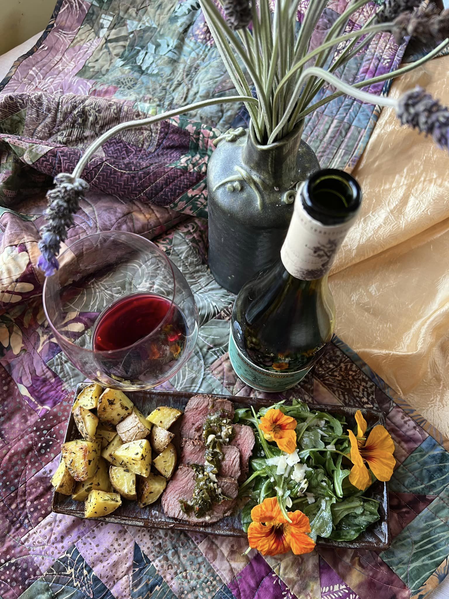 Pairing: The structure and the tannins are completely tamed when this wine is paired with intensely flavored foods. The chimichuri was such a perfect companion with the grilled filet mignon topped with chimichuri sauce. The herbs on the oven roasted potatoes were also a beautiful companion to the wine. The herbs and garlic in the chimichuri sauce bring this big bold tannic wine to a completely different wine. It becomes smooth and has much more ripe fruit. Great with the salty Parmesan cheese in the arugula salad. Nice with the big bold peppery arugula. The salad stands up to the wine and the wine becomes mellower with the salad. The lemon, and the peppery notes are enhanced in the salad as well. We felt that anchovy filets would be a great addition to the salad when pairing with this wine.
