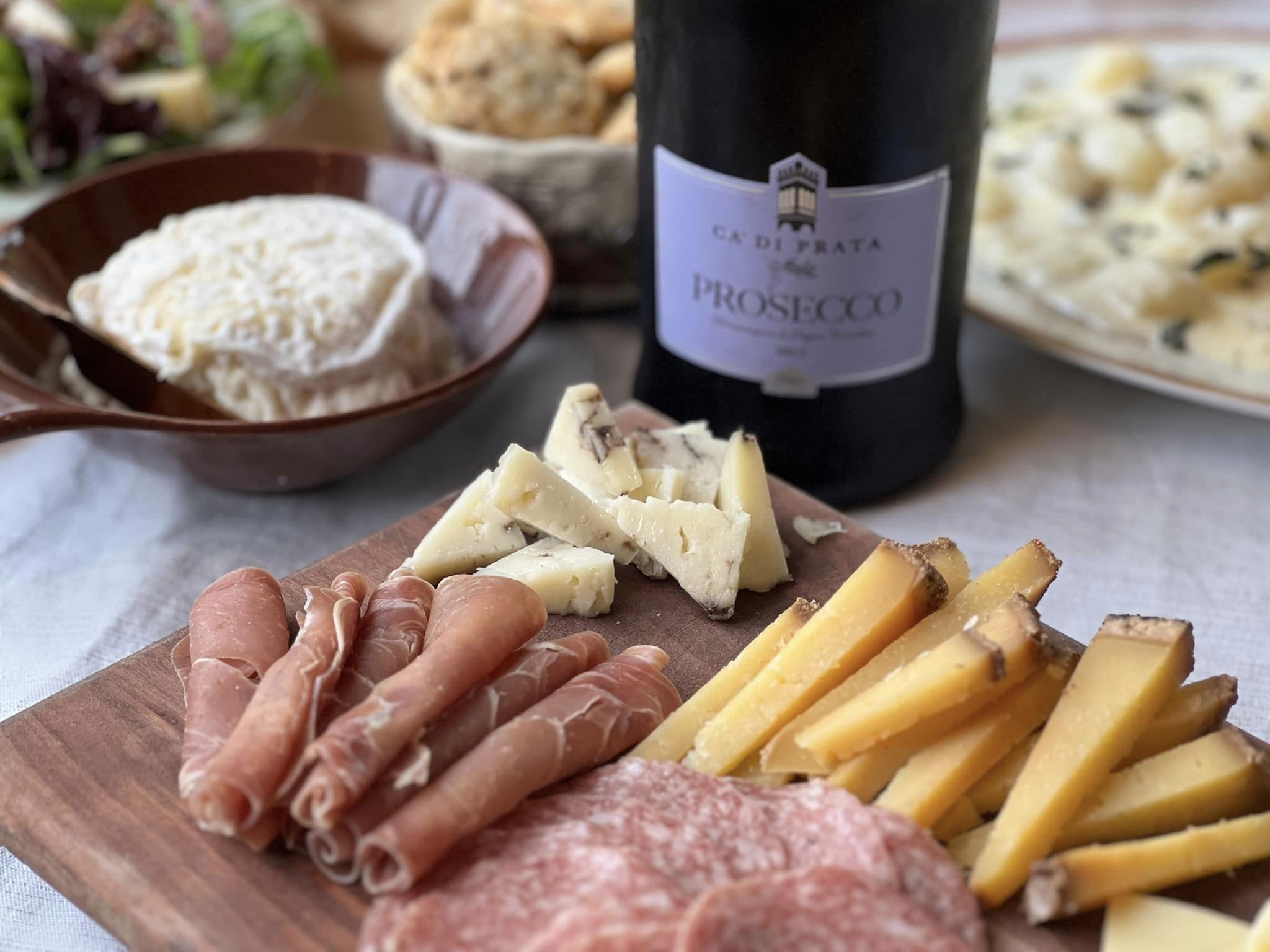 Pairing: So lovely with the LaTur which enhances the bright cherry fruit in the wine. Fantastic with the truffled pecorino. So yummy with the salty prosciutto and salami, the wine cuts through the cheese richness of the gnocci and the the fresh basil garnish brings out the minty herbs in the wine. The basil oil on the salad also works so nicely with the wine.