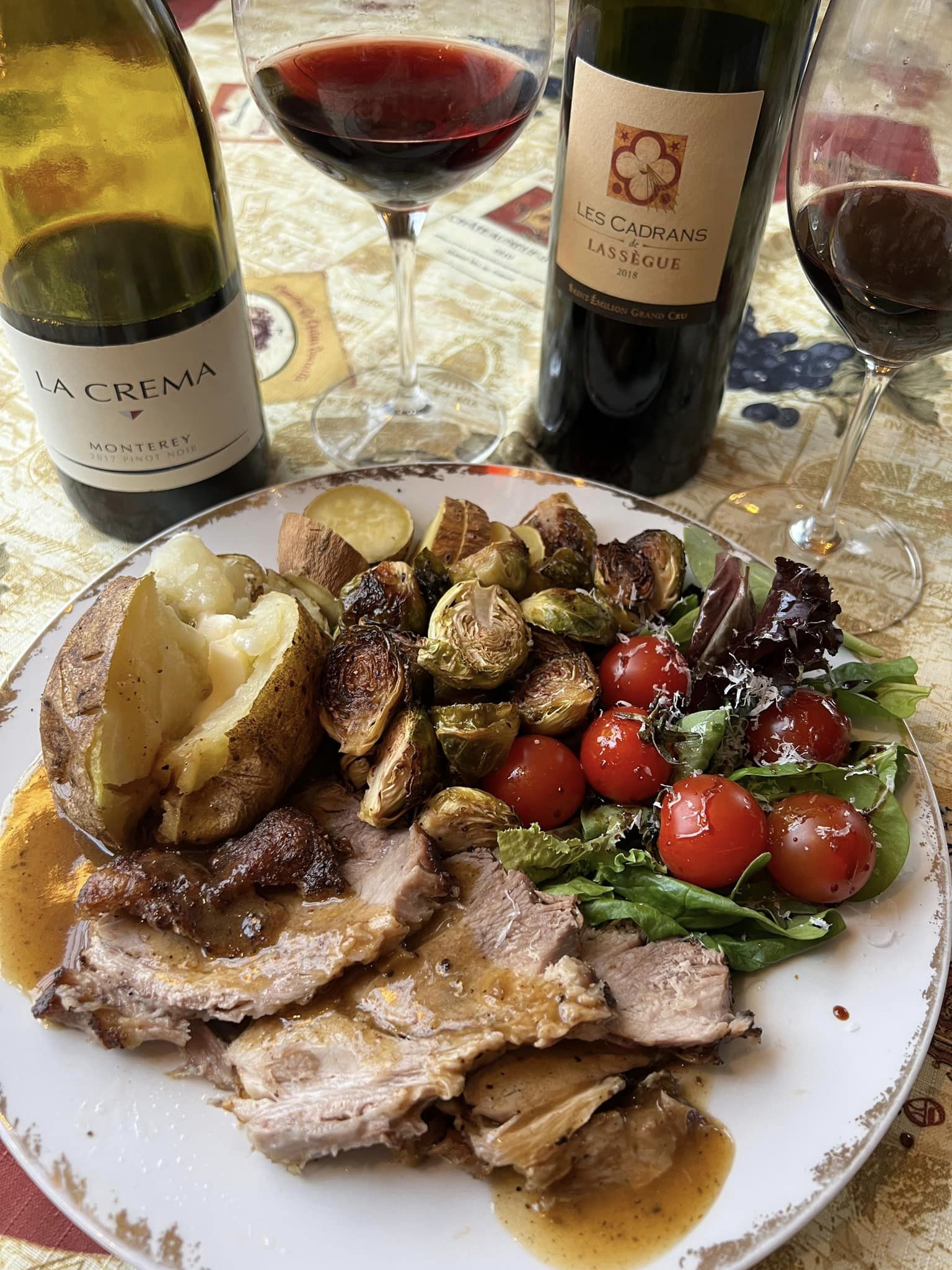 These other paired French and other world wines are all similar in character while the two at hand were rather different so our next challenge was a meal that would work both with a Monterey Pinot Noir and a Right Bank Bordeaux, but the pork roast with gravy and roasted vegetables did the trick. Keep reading for all the details!