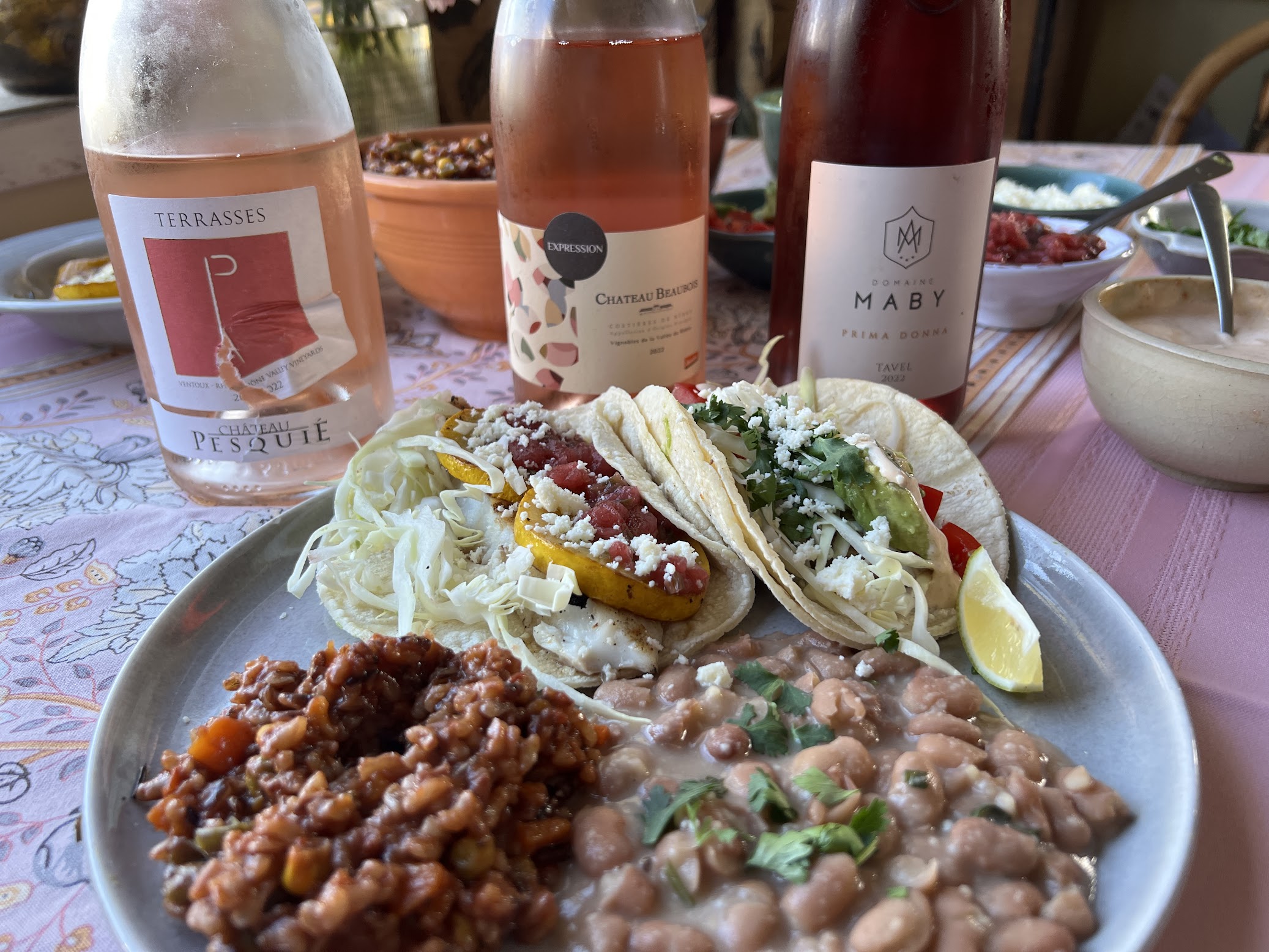 Pairing: The grilled fish on its own is perfect with the wine, the taco with the apple salsa is outstanding with the wine, also very nice with the cream sauce on the taco, the sauce is complex and works together with the tomato, creamy avocado and the savory notes bring out the fruit in the wine. While both tacos worked so nicely with the wine, we both preferred the taco with the apple salsa. The wine also worked very nicely with the beans and the rice, the wine responded well to every element in our meal. It is a wine that you want to clean your plate with.