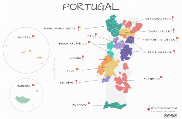 While my press trip to Portugal focuses on the Alentejo region, wine is grown in 14 different areas of Portugal, from the island of Madeira to the Douro in the north, the Algarve in the south and almost everywhere in between as you can see from the map below.