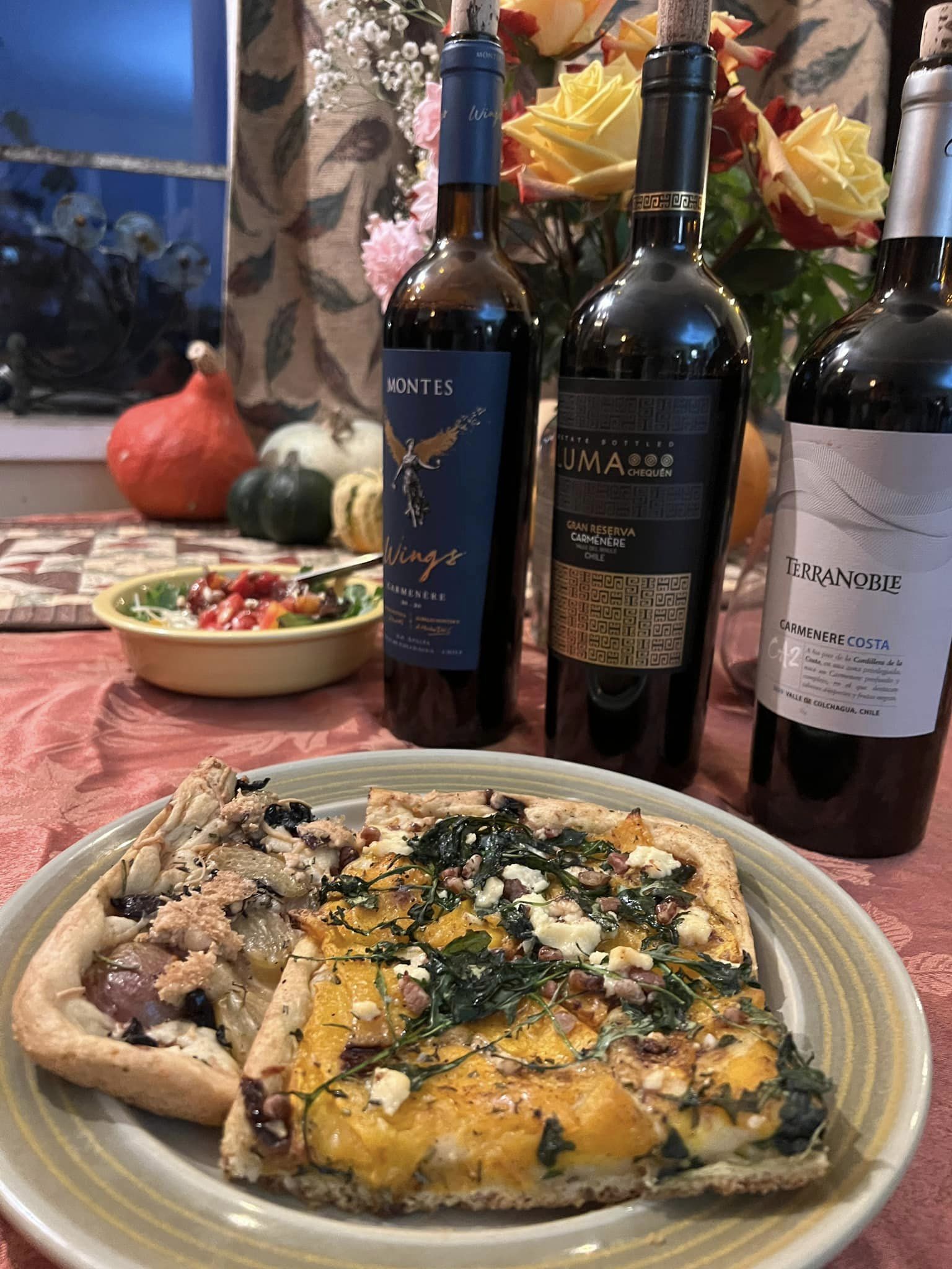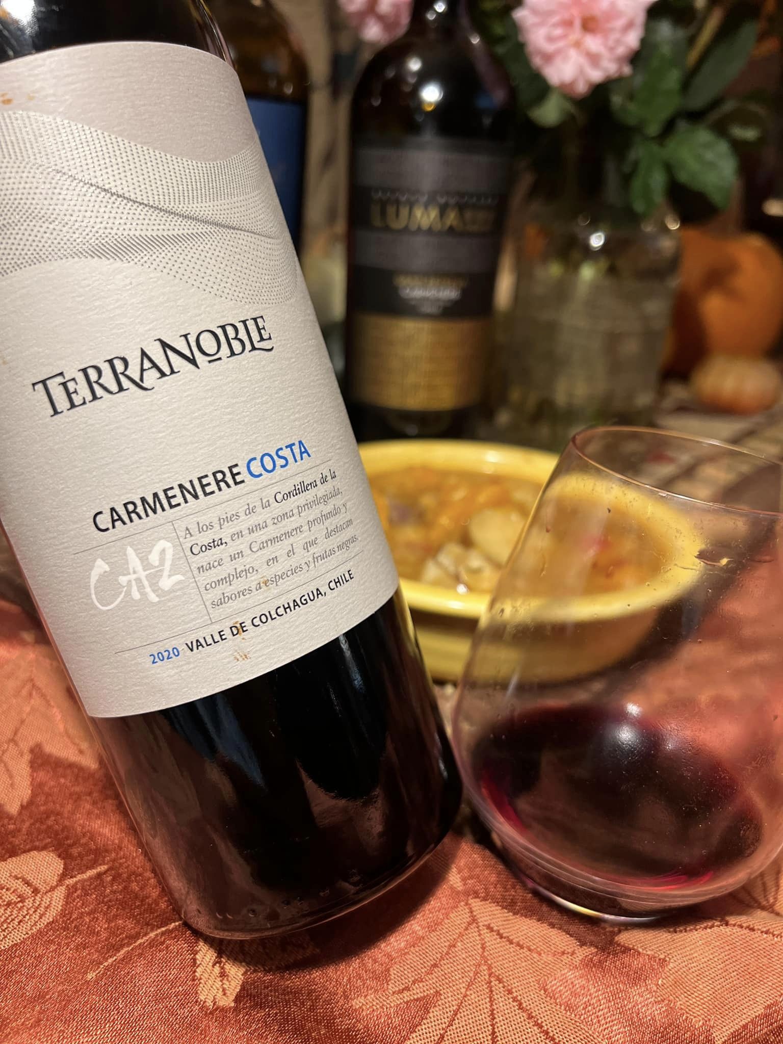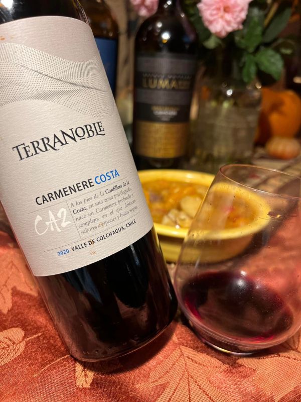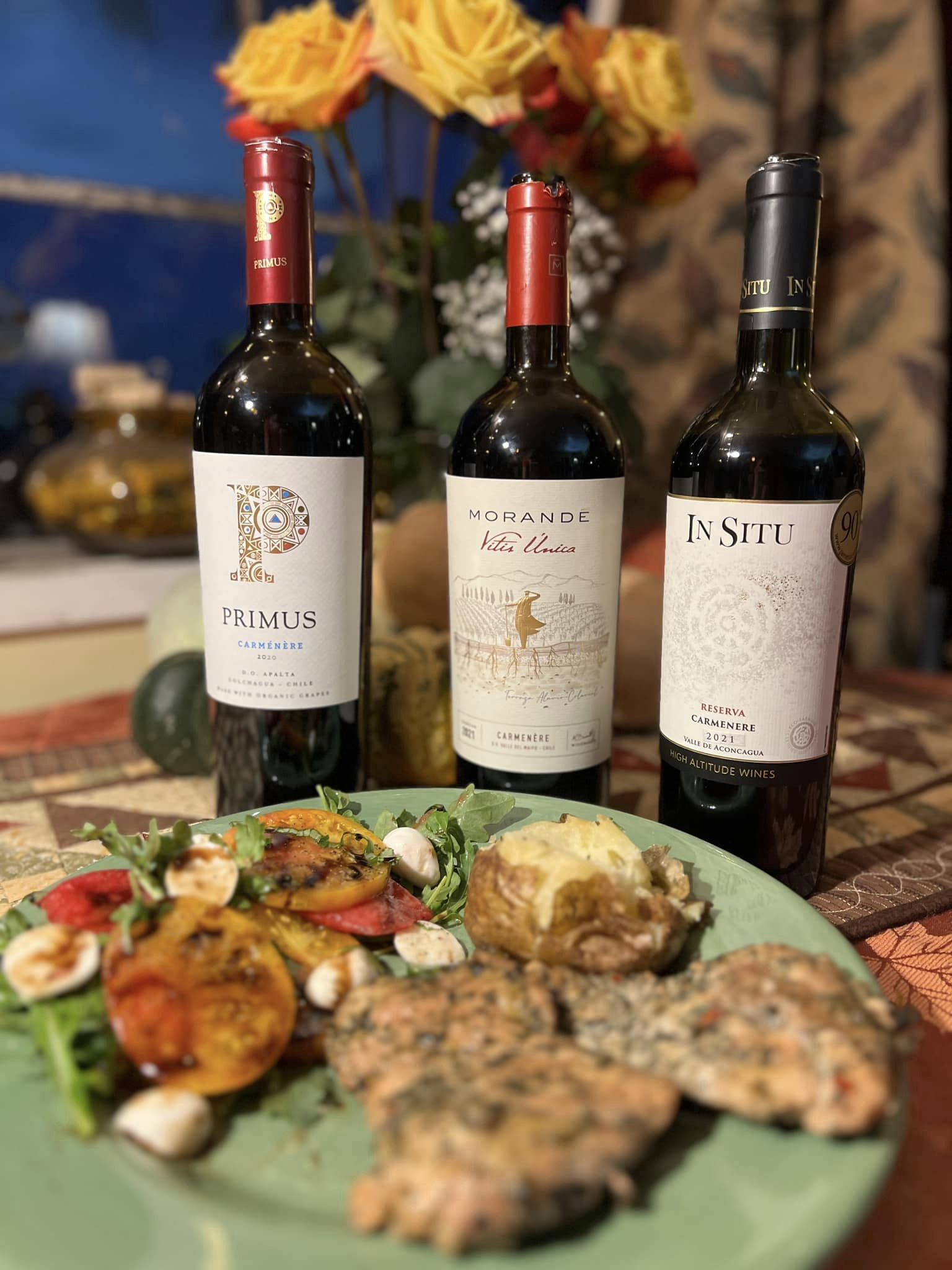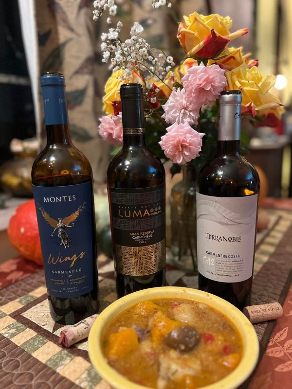 So what to pair with Carménère? Just about anything goes — as long as it has chimichurri sauce! Yes, even a rich fish or chicken marinated in it or simply drizzled over it makes any food pop and pair with Carménère which can be fun for a change of pace. If you’re fond of wintry stews, a traditional Chilean beef stew with squash pairs well, and was the suggestion of the Chileans on a recent ZOOM. After tasting the wines, we decided to pair the lighter, greener wines with the chicken and the heavier, fruiter oakier wines with the beef stew.
