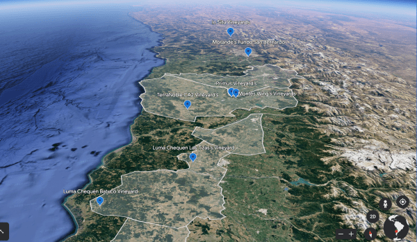 So where Carménère is planted makes a difference in the wines. In 2021, 25,500 acres were planted in Carménère in Chile, with many vineyards full of old vines with newer ones planted alongside. Carménère  does well in mild, cooler areas with plenty of sunshine like the Colchagua and Cachapoal Valleys in the O’Higgins region where Carménère dominates with 14,000 acres or 55% of the vineyards. In  valleys that run from the Andes west to the coast, Carménère produces a range of different styles. With over 8k acres, Maule has the second most Carménère vines. While climate is similar, the soils vary as well as the ages of the vines.