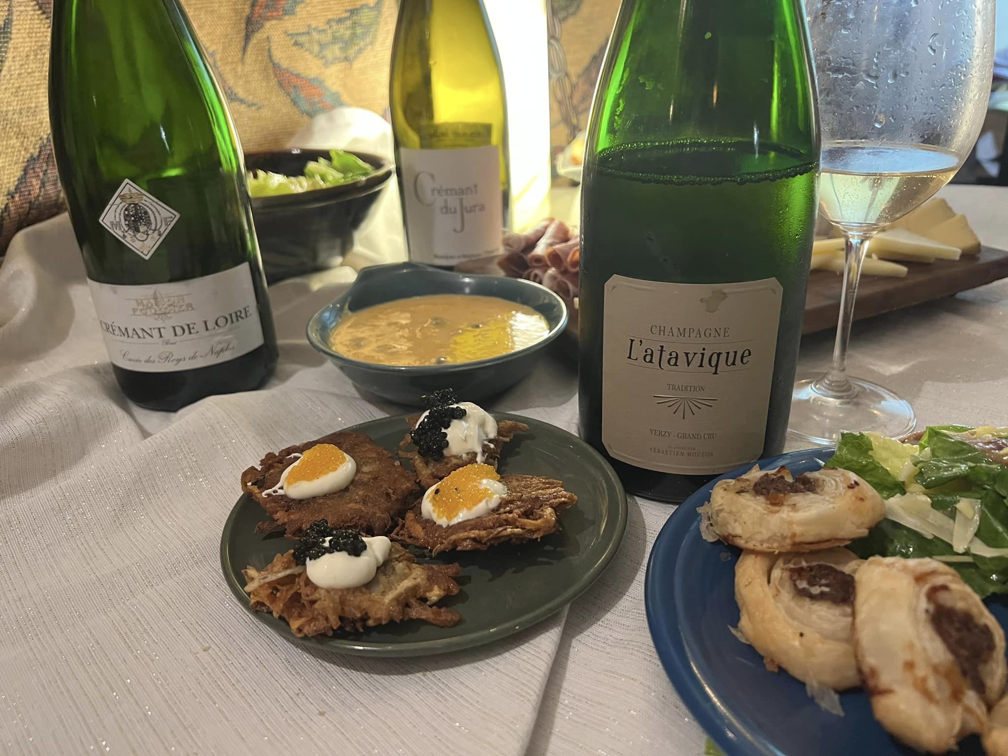 While the latkes are more work, they are so fabulous with sparkling wine as a small serving with a dollop of creme fraiche and caviar.