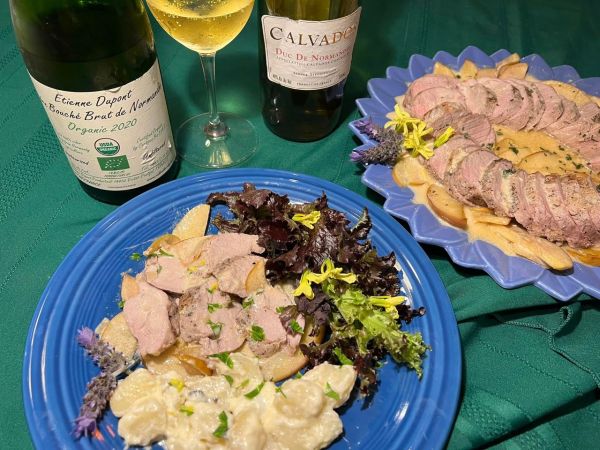 - June 16th Organic Normandy Cider with Calvados Cream Pork Loin and Ancient Map: “This was a challenging prompt for us. When I was researching Normandy apples kept popping up. Without a wine sample to guide us we didn’t know where to go until I stumbled on to the organic cider from Normandy that I found at our local liquor store here in Ojai. In the end everything came together and worked well.”