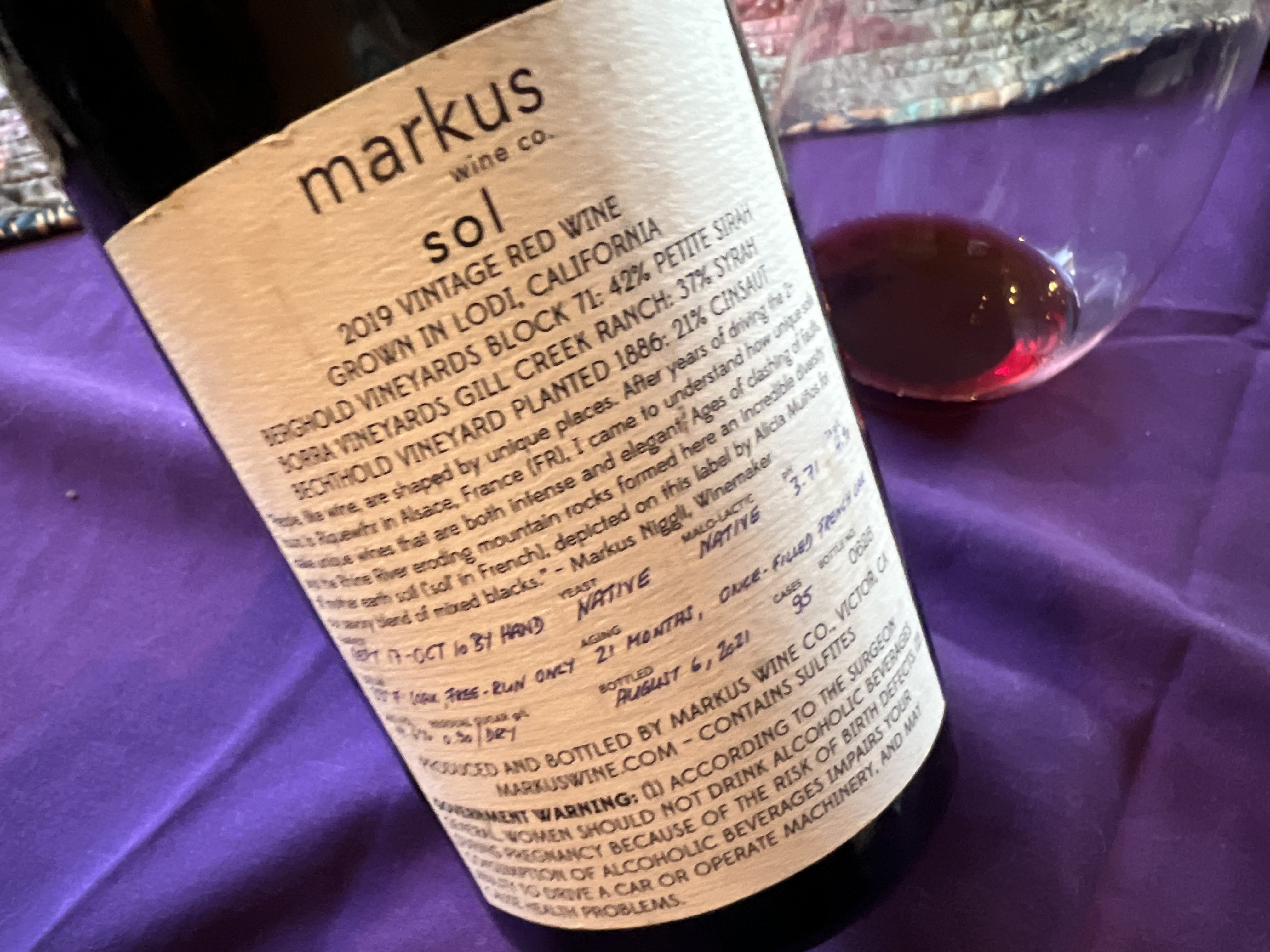 As indicated on the bottle, inspired by Riquewihr in the Alsace.Winemaker Markus Niggli says he drove two or more hours through this region regularly for many years, and that drive led him to understand how “people, like wine, are shaped by unique places” and that “unique soils make unique wines that are both intense and elegant.” The name “sol” means soil, and the image by Alicia Muinos depicts the diversity of the soils created via tectonics and erosion. The current vintage includes zinfandel and petite Verdot along with the petite sirah.