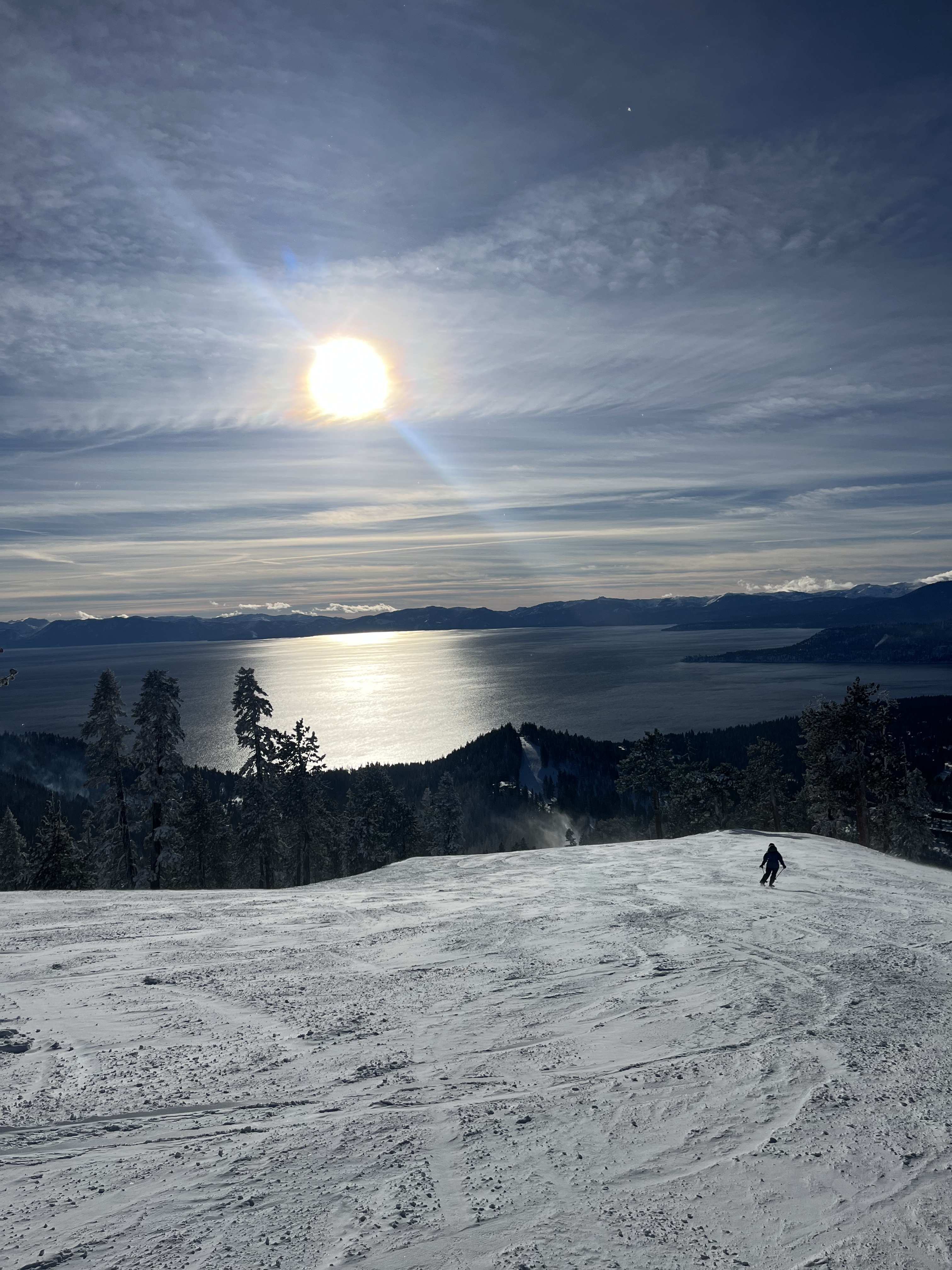 Gwendolyn Alley skiing at Diamond Peak above Lake Tahoe on her birthday 1/11/2024; photo by her son Reed Sheridan