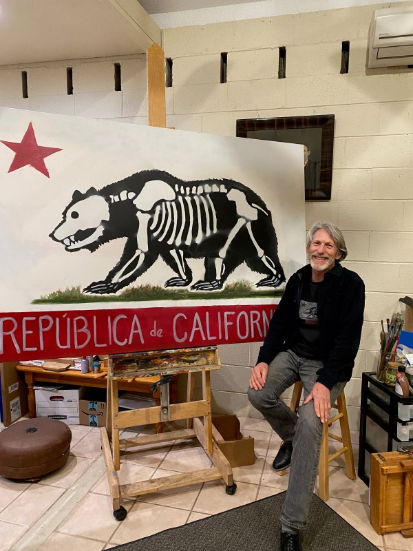 Patrick G Duffy in his art studio with one of his paintings which is available on t-shirts
