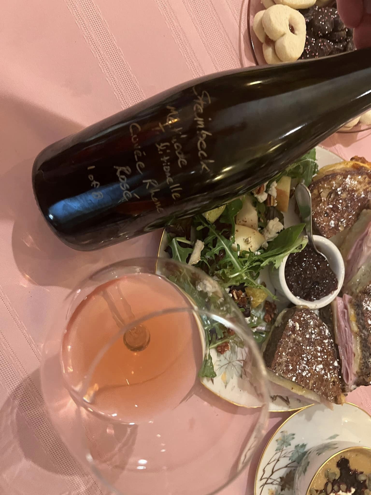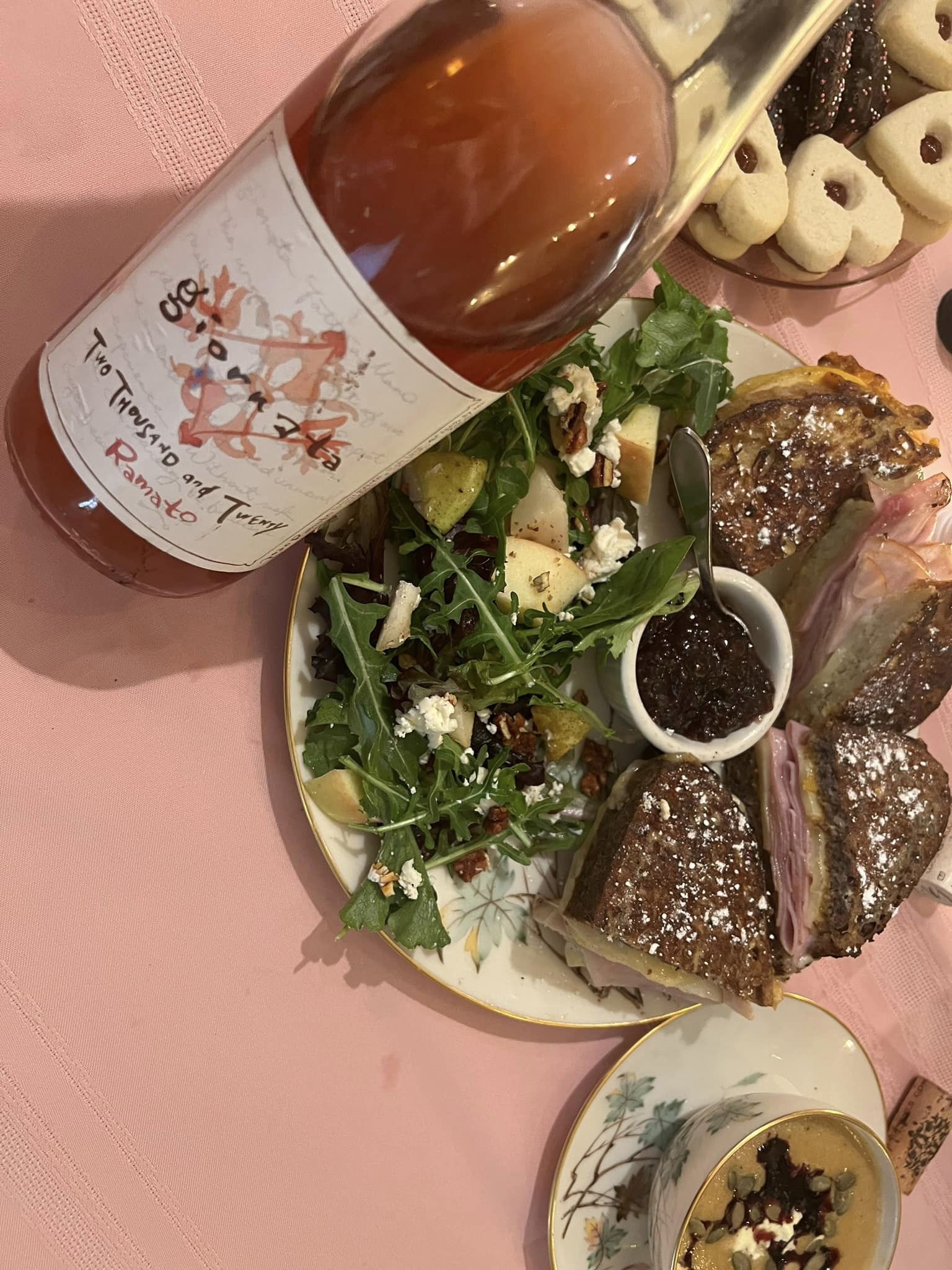 Pairing: The apricot curry mustard sandwich was so absolutely amazing together with the wine, the pear gureyer smoked turkey sandwich was not good with the wine at all, too sweet, all wrong, gummy bubble gum in my mouth, very good with the cheddar apple sandwich we imagined that if there were a couple slices of crispy bacon on the sandwich it would be that much better, also quite good with the traditional Monte Cristo the smoke in the ham and the honey turkey work well with the wine, so good with the salad bringing out an orange oil flavor, the fruit is not too sweet, the cheese is rich and creamy, also loves the spicy kick in the spiced pecans, the soup were not perfect companions, the soups and the spices were a bit tooo much for the wine, the soup over powered the wine and made the wine a bit too bitter.