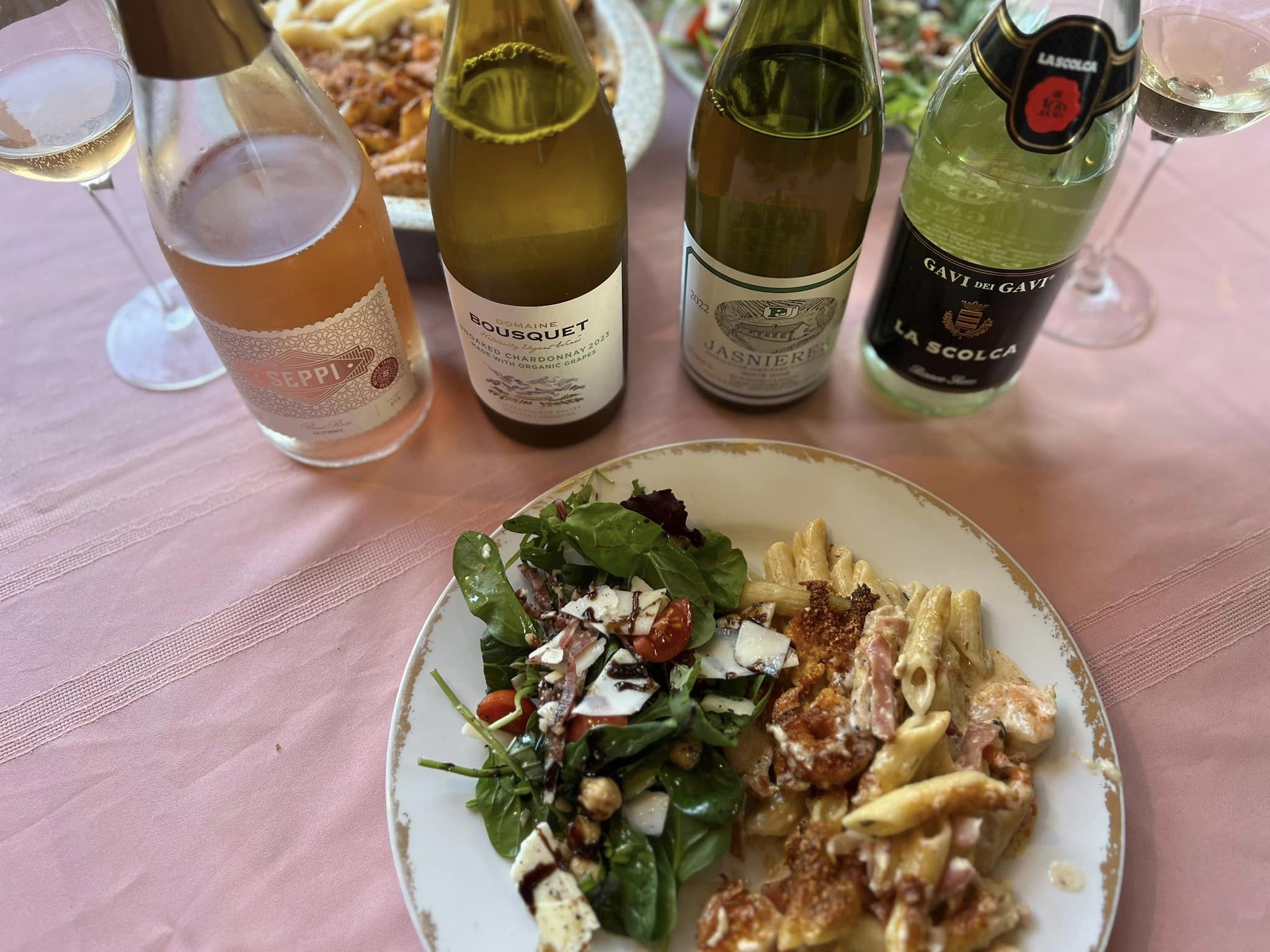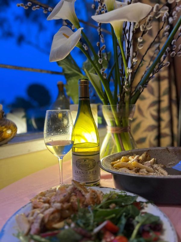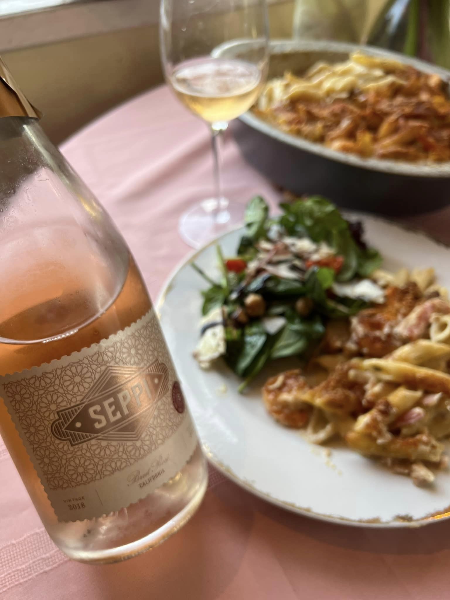 Pairing: The wine responded nicely to our antipasto salad loving the spice and richness in the garbanzo beans, the wine becomes sweeter and fruity with the pasta, it worked so well with all of the elements in the dish as well, great with the shrimp and the chicken and the procuitto