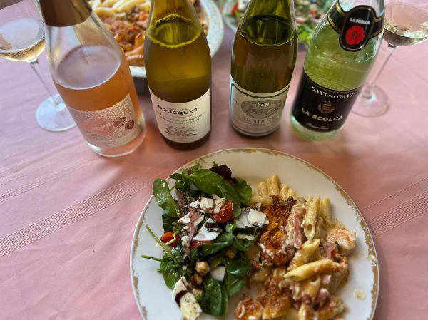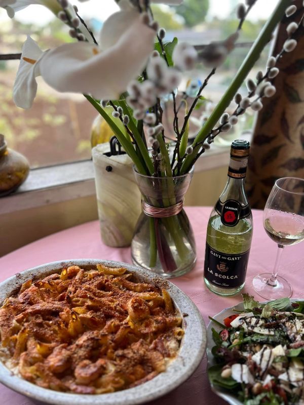 Pairing: This wine loves the sweet balsamic glaze, brings out the fruit in the wine and the sweetness of the tomatoes in the salad. The salty richness in the pasta dish works beautifully with the wine. The complex flavors and richness of the meal are swept away and cleansed by the wine. The sweet shrimp in the meal are a perfect compliment to the wine. The bright acidity of the wine is tamed completely by the wine.