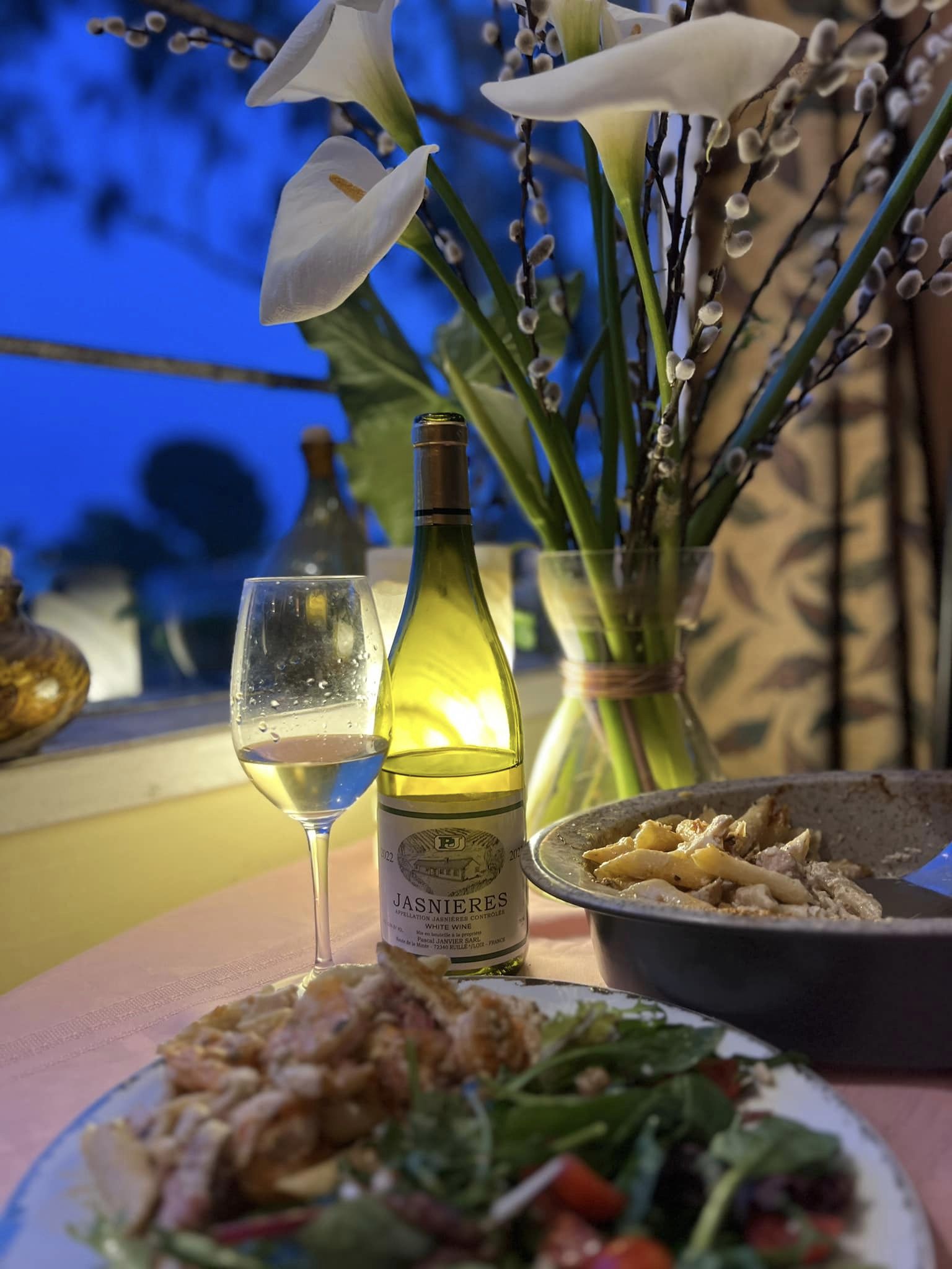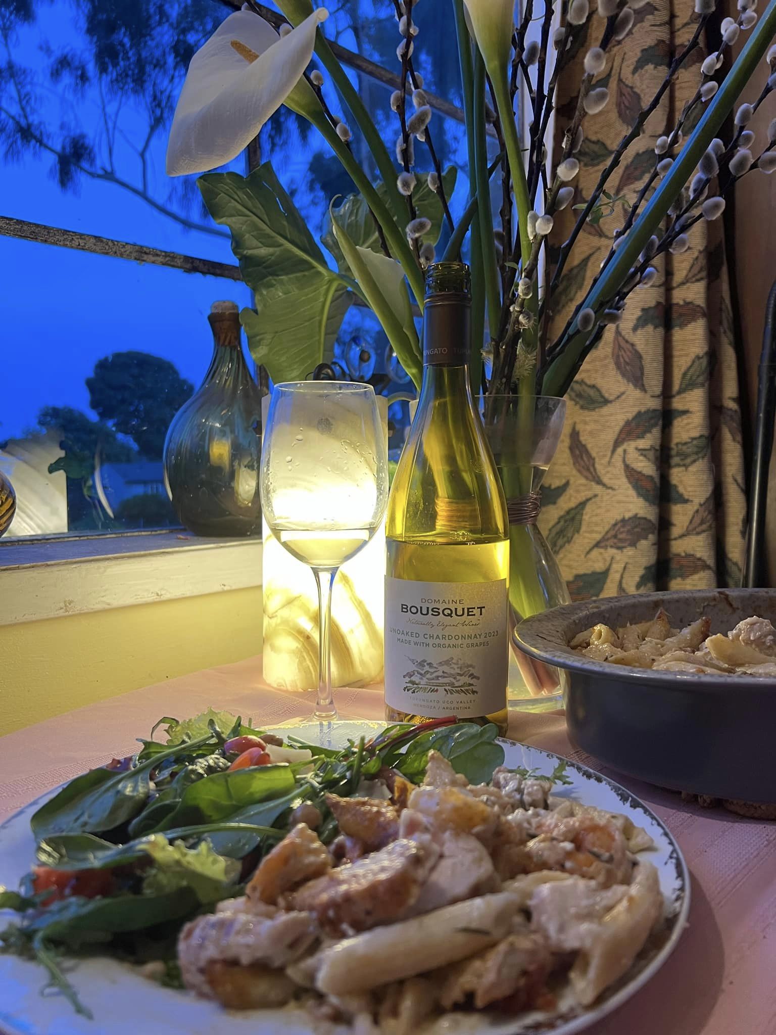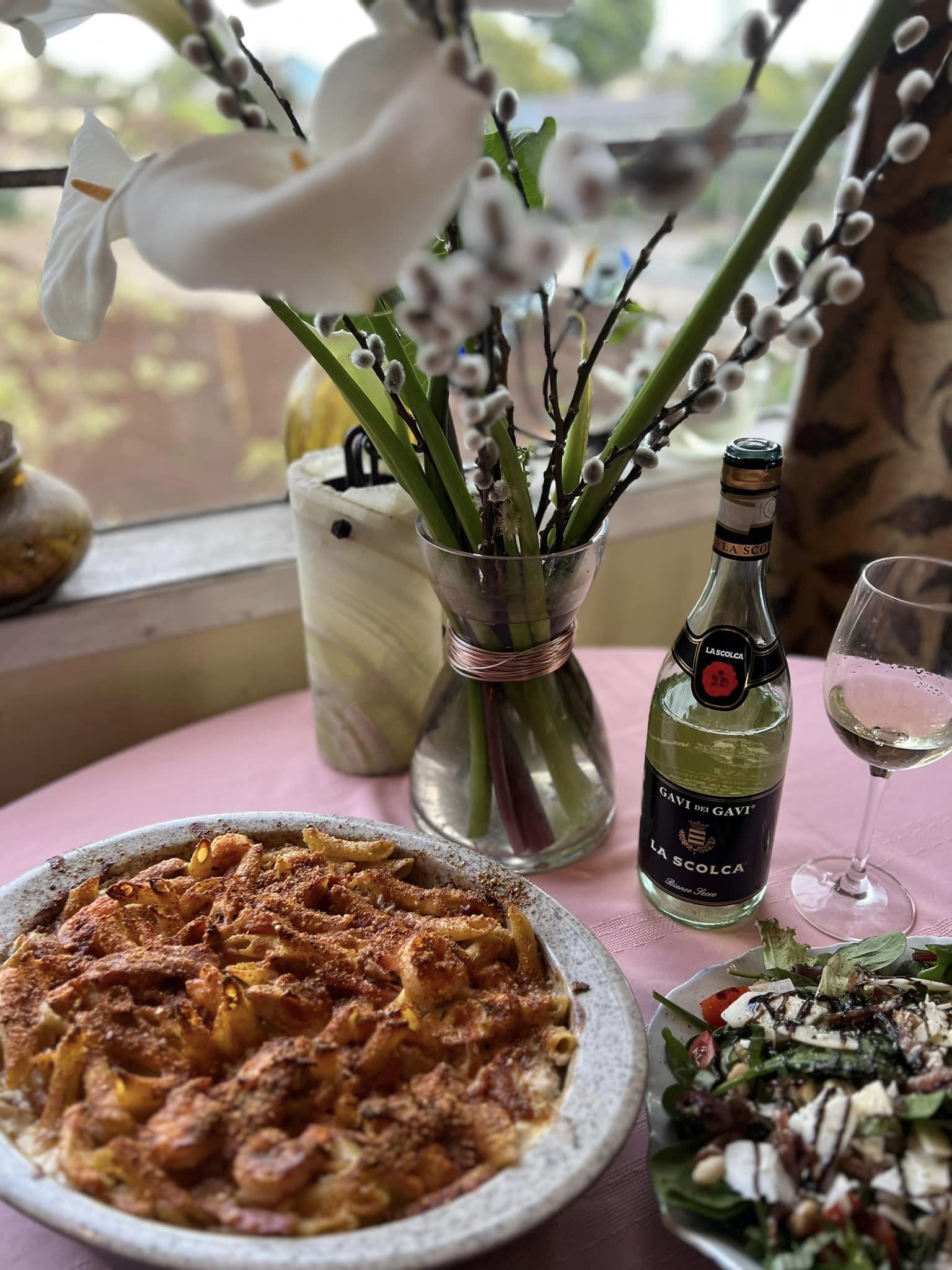 Pairing: The wine loves this meal, the slick mouthfeel of the wine matches the rich creamy pasta, reacts nicely to the kick of spice and works so well with all of the complex flavors in the pasta dish and the salad. The fresh basil in the salad is enhanced by the wine and the wine is enhanced by the fresh basil, also fantastic with the salami in the salad loving the pepper kick