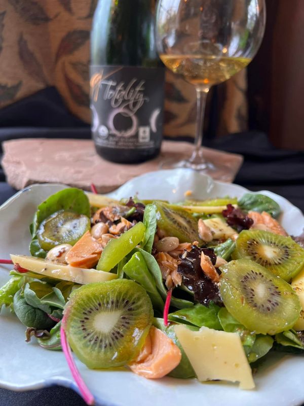 So an invitation to hang out with the Freys more, and their extended family was very tempting — and I knew there’d be good wine! But I had no idea we’d be toasting the eclipse with a 2007 vintage traditional method sparkling wine which they had labeled for the 2017 Oregon eclipse — and this was leftover so they brought it from Mendocino to Texas– and I brought one home to California to share with Sue; read about it below. We paired it with a cheese board and a salad with smoked salmon, kiwi, and truffle cheese.