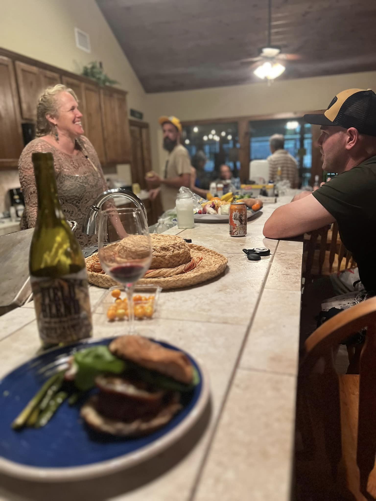 Frey family: assistant winemaker Eliza Frey and husband vineyard manager Derrick in the yellow hat — Field blend with a ground pork and beef burger