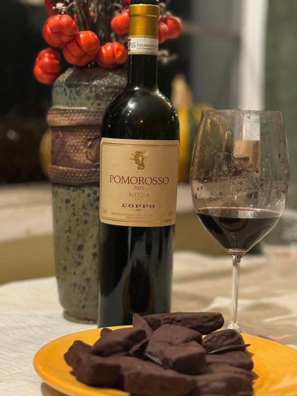 2021 Coppo Nizza DOCG Pomorosso with Christmas cookies from Campania