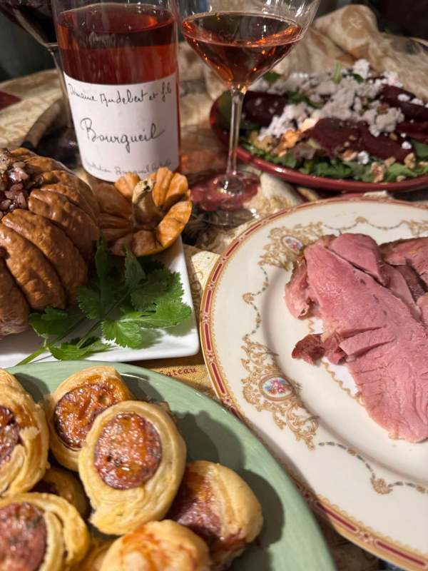 Pairing: No surprise to us the wine went very nicely with the sausage rolls, the cherry notes in the wine are enhanced and the herbs and spices in the sausage pops when the two are paired. Perfect with the ham, the spices and the glaze on the ham bring out beautiful baking spices in the wine, the wine becomes full of fruit and the spices and smoke in the ham are enhanced, the wine elevates the ham and the ham elevates the wine, very nice with the stuffed squash loving the pancetta and seasonings in the rice, bringing out the lovely fruit in the wine, so very good with our beet salad, bringing out such a lovely spiciness to the wine.