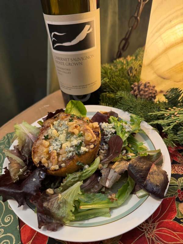 2020 Frog’s Leap Cabernet Sauvignon Rutherford, Napa Valley with salad of grilled pear stuffed with gorgonzola