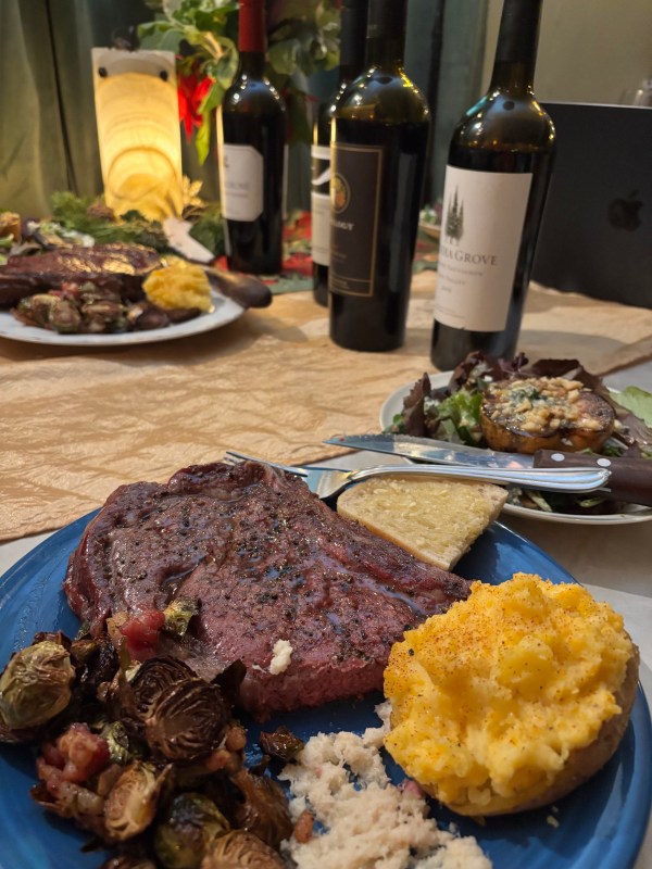 Pairing: The Flora Springs “Trilogy” is a great wine for a holiday gathering… but it wasn’t the greatest with our salad which we loved so much throughout the meal with all of the other wines. It just became a caramel mess in your mouth, too sweet, too sticky, totally uninteresting together. Perfect with the twice baked potatoes: there are layers of flavors in both the wine and the food. The brussels sprouts were also amazing with the wine–together the char and the sweet roasted shallots were a perfect companion to this rich Napa wine. So perfect with the fresh garlic in the garlic bread. This wine was by far the best with our juicy smoky steak.