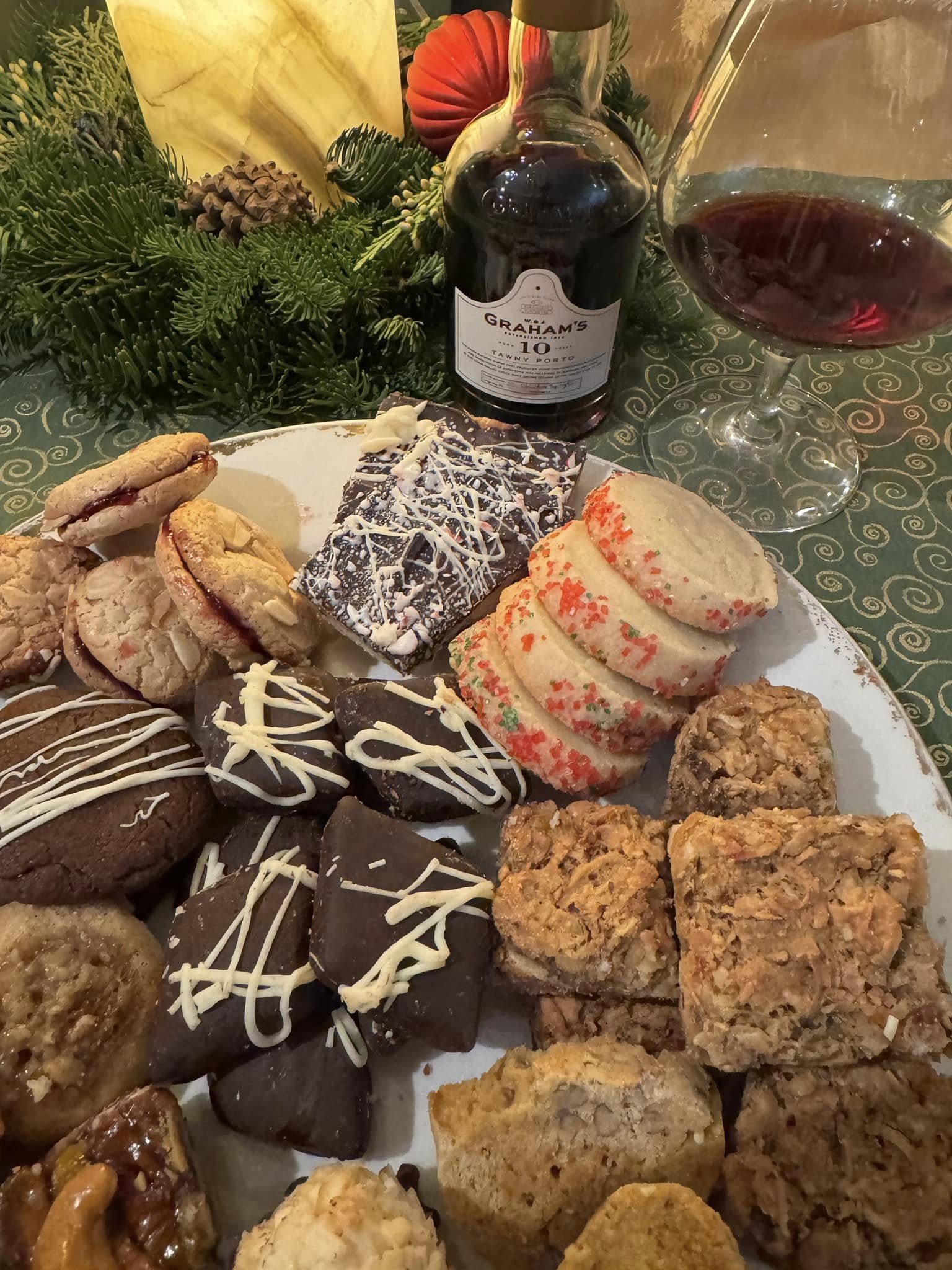 Pairing: The port tastes like a jelly donut when paired with the raspberry almond sandwich cookies as well as bringing out the lovely almond flavor in the cookie. So very nice with the butterscotch biscotti because the wine is sweeter than the cookie and all the butterscotch marries into the wine so nicely. The cookies and the wine are tamed down in sweetness, the wine even went with the peppermint bark which was quite sweet, but went beautifully with the wine.