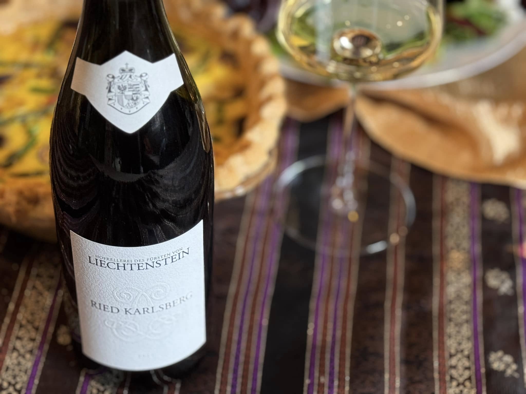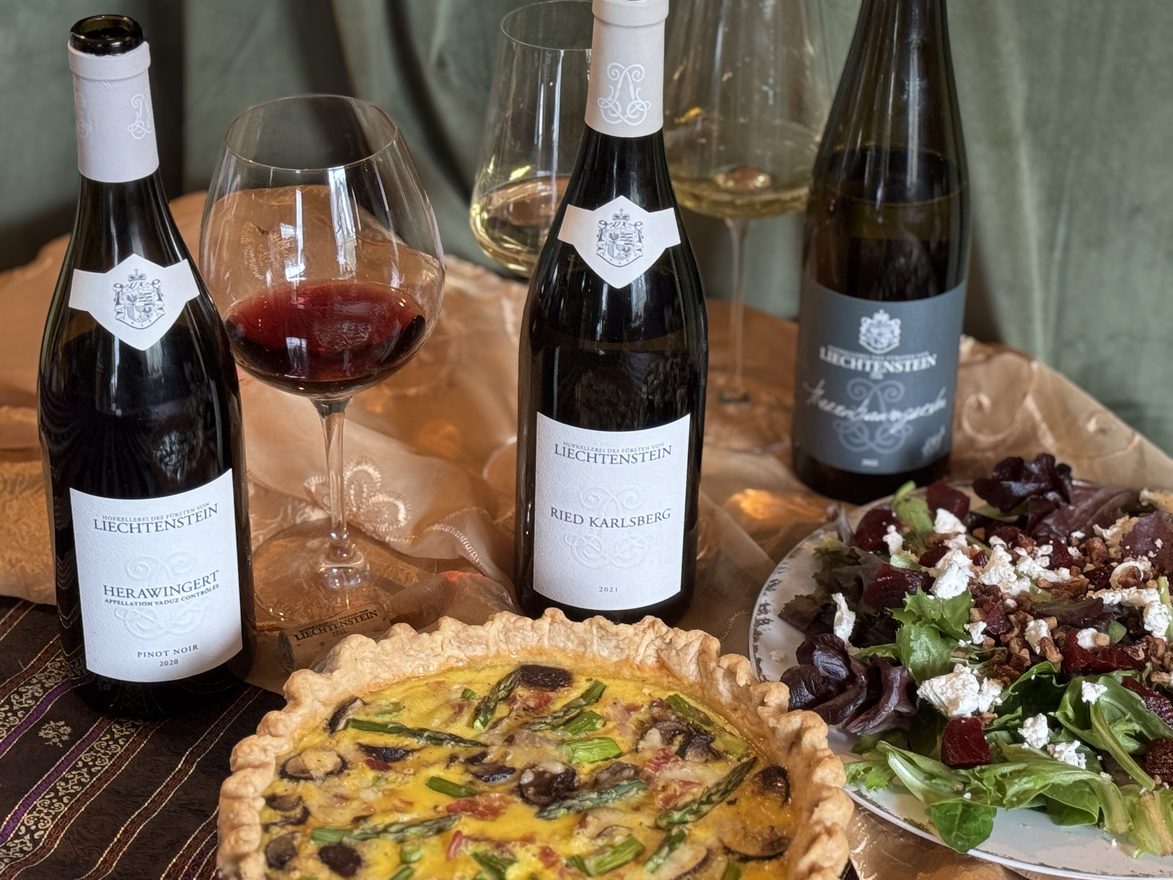 Happy Pi Day! Today is 3.14 and we are celebrating Pi Day with these wines and quiche— a savory egg and cheese pie that originated from the part of Europe where today you’ll find France, Germany, Austria and Liechtenstein! The word “quiche” comes from a German word too: “kuchen” or cake. The official language of both Austria and Liechtenstein is German. While most people think of quiche as being French, the truth is that the boundaries in Europe have fluctuated, and at one time, where quiche was invented was in German called Lotharingen aka Lorraine which is now in France. Looking at an old map to me it included modern day Liechtenstein where they enjoy asparagus too and since we were pairing riesling and pinot noir, Sue made a quiche with asparagus, prosciutto, mushrooms, Emmental and gruyere cheeses! To be honest, this part of Europe and its history is little known to me and I look forward to learning more and having a better understanding by going there.