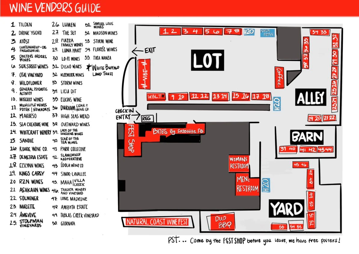 The event is both a consumer and professional event, and producers may elect to list a certain number of wines for sale. All wines listed for sale on the Natural Coast Website will be available for pre-order; pickup and shipping orders may be placed until noon on Tuesday, April 28th. Satellite will handle all of the sales and fulfillment from our wine shop @ 1117 State Street, Santa Barbara, CA 93101. They‘re offering a flat $30 fee to ship wines from the festival anywhere in the Continental US with some exclusions.
