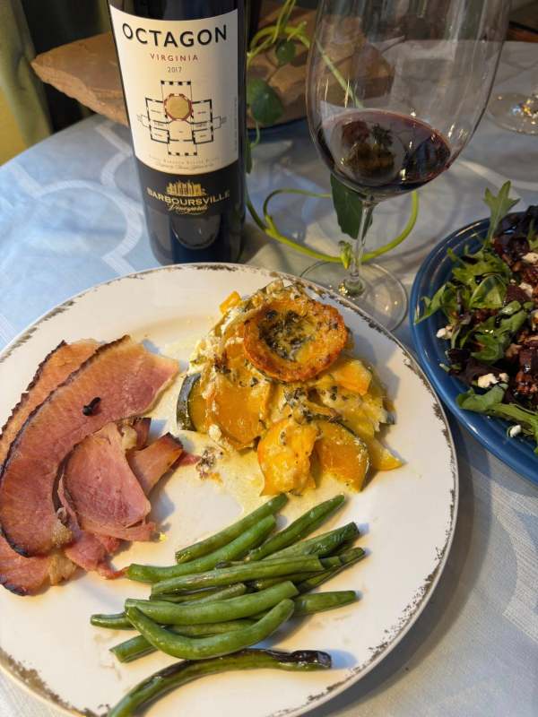 Once I learned Virginia’s Smithfield ham is a signature dish we switched from meatloaf to ham, and decided to use apples in a green salad, but then after tasting the wines, we switched to beets. Instead of pumpkins, we used other winter squash in a gratin. Read more about Virginia’s cuisine here.