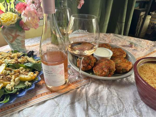 Organic Côtes du Rhône Rosé with Salmon Cakes, Squash Soup, Salad