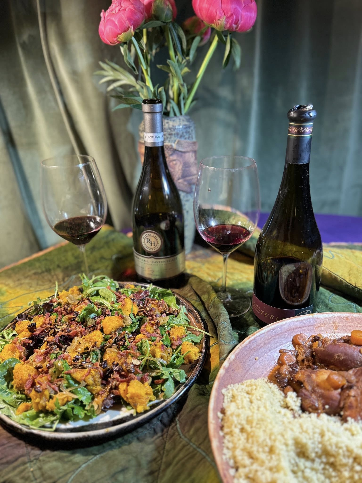 Pairing: Pate brings out lovely fruit in the wine, so good together, it made me think about duck breast with a fruit sauce: that would be perfect with this wine, the baked brie was also fabulous with the wine, because the squash is so sweet it needs the salty bacon and spicy savory nuts to balance it out and it goes absolutely perfect with the wine. the chicken dish is perfect with the wine, it loves the richness of the protein, sweet fruit, and all of the lovely spices that go so perfectly