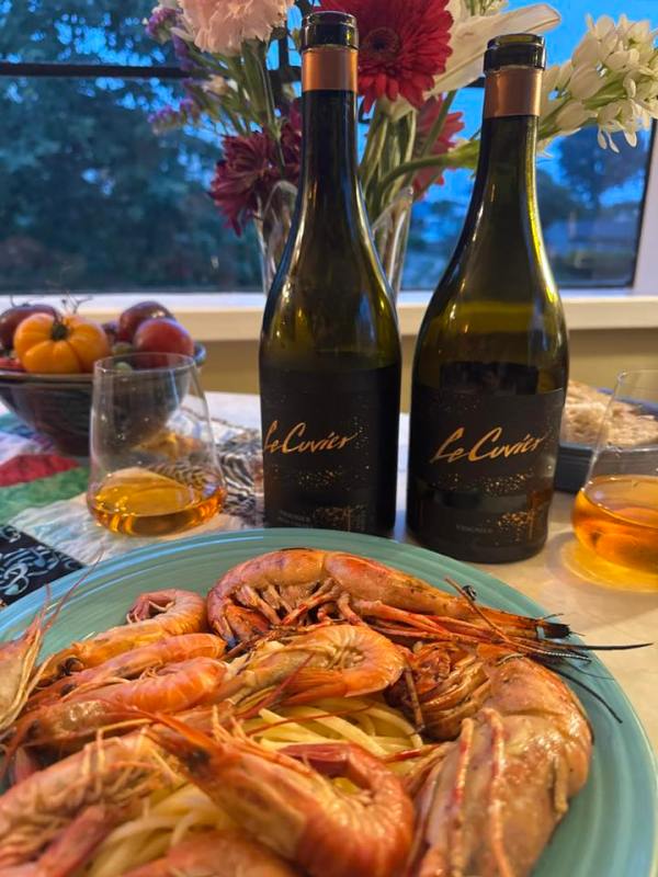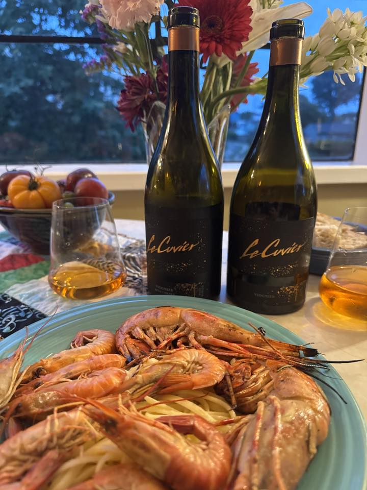 Back home following the Paso Robles Regenerative Organic Certified press trip, I went to our local Fisherman’s Market and bought fresh SB spot prawns and ridgeback shrimp. That night, I prepared them in butter, oil, garlic and a little viognier on a bed of preserved lemon pasta paired with Le Cuvier Winery 2013 and 2020 Orange aka extended skin contact Viognier which I had opened in Paso Robles on Thursday night in advance of Friday’s Viognier Day. I was unsure how it would pair but wow! And look at that gorgeous color!