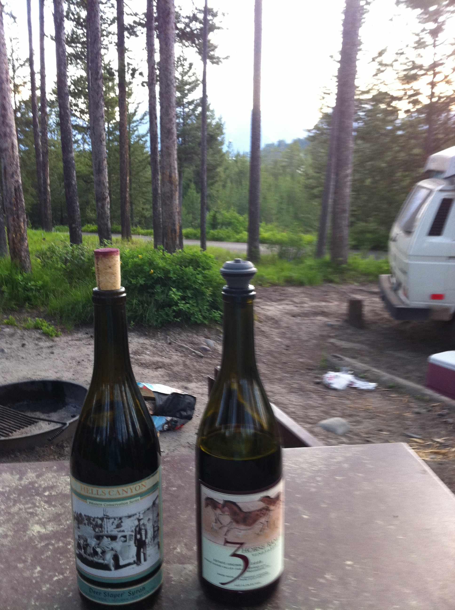 I’m starting out near the headwaters of the Snake River in Wyoming. Pictured above are two Idaho wines in our Grand Teton campsite that we had with elk burgers, and the same wines which we enjoyed the next night along Grassy Lake Road near Yellowstone with buffalo burgers! (In case you’re wondering, I prefer elk. And both syrahs were different but awesome. More on that later.)
